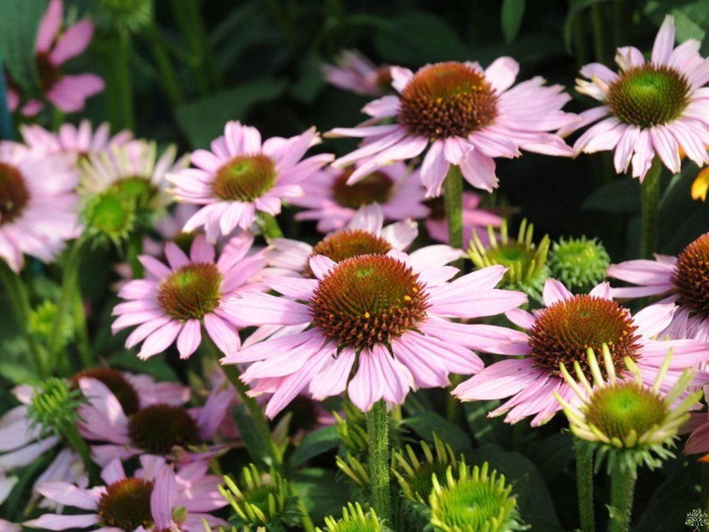 Echinacea 'Conetto Melon' - ein niedriger Strauch, der in Höhe und Breite etwa 30 - 40 cm wächst. Das Wachstum ist kompakt, sehr dicht. Die Blüten haben eine zarte, pastellrosa Farbe; während der Saison werden sie dunkler. Die Mitte ist orangebraun, mit leichten grünlichen Tönen. Die Blüten blühen den ganzen Sommer über, von Juli bis Oktober. Die Staude ist eine Attraktion für Schmetterlinge, Hummeln und Bienen. Eine Kombination aus mehreren Sorten von Echinaceen wirkt schön, zum Beispiel im Vordergrund von niedrigeren grünen Sträuchern. Die Blüten eignen sich zum Schnitt oder als Teil von Blumenarrangements. Sie ist pflegeleicht und voll frosthart.
