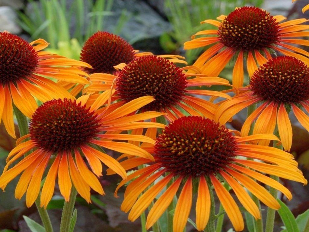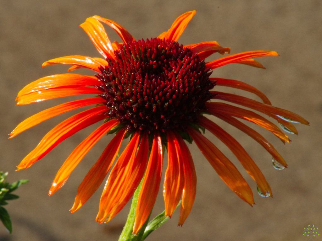 Echinacea 'Flame Thrower' - wurde in der amerikanischen Baumschule Terra Nova Nurseries in Oregon gezüchtet, die Autorin ist Harini Korlipara und die Sorte ist durch ein Pflanzenpatent geschützt. In der Genetik spiegelt sich der Anteil der Art Echinacea paradoxa wider, weshalb die zungenförmigen Blüten eine schmalere Form haben und ein ausgeprägtes gelbes Pigment tragen, das in Orange und an der Basis bis Rotorange übergeht. Die Blütenköpfe sind 8–10 cm groß, das Zentrum ist dunkel rotbraun und das Ganze wirkt wie eine Flamme inmitten eines Sommerbeetes. Der Duft ist zart blumig und süß. Die Pflanze bildet gut verzweigte Stiele und die Blüten erscheinen nacheinander, sodass an einem Büschel gleichzeitig Knospen und verblühte Blütenstände vorhanden sein können. Sie eignet sich für Prärie- und Naturgärten, zu Ziergräsern, Schafgarben, Sonnenhüten, Agastachen und für gemischte Kübel, wo ihre warme Farbe zur Geltung kommt. Die Blüten liefern Nektar für Bestäuber und eignen sich geschnitten für Sommersträuße. An Standorten mit normalem Gartenboden kommt die Ausfärbung in voller Sonne am besten zur Geltung, wo sich die gelben Spitzen der Strahlen deutlicher vom orangefarbenen Grund abheben. Die Pflanze wird etwa 80–100 cm hoch und eignet sich für sonnige Beete.