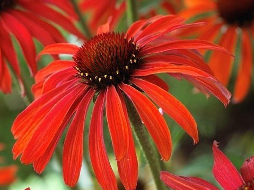 Sonnenhut 'Hot Summer' - eine wunderschöne Staude, die normalerweise eine Höhe von etwa 70 - 80 cm erreicht. Eine Sorte mit orange-roten Blüten. Das Zentrum wird von einer größeren Anzahl brauner Stempel gebildet. Die Blüten erscheinen von Juli bis August. Hot Summer ist eine Anziehungskraft für Schmetterlinge, Hummeln und Bienen. Eine Kombination aus mehreren Sorten von Echinaceen wirkt schön, zum Beispiel im Vordergrund von niedrigeren grünen Sträuchern. Ideal für die Pflanzung in Beete oder Kübel. Sie ist pflegeleicht und voll frosthart. Die Blüten eignen sich gut als Schnittblumen.