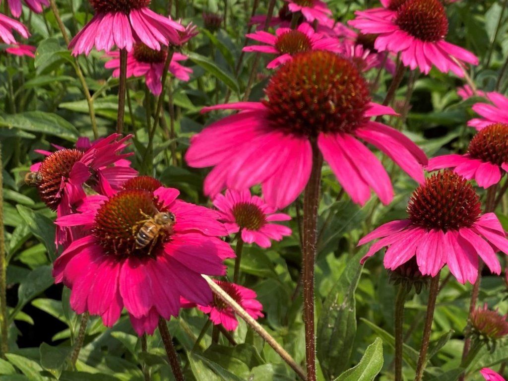 Echinacea 'Pickup Pink' - eine kompakte, dicht wachsende Staude, die leuchtend fuchsiafarbene Blüten mit einem auffälligen dunklen Kegel in der Mitte bietet. Sie erreicht eine Höhe von etwa 30–40 cm. Die Blütezeit ist von Juli bis September, wenn sie zahlreiche kleinere Blütenkörbchen mit einem Durchmesser von etwa 5–7 cm bildet. Die Blätter sind eiförmig, an der Spitze zugespitzt und tiefgrün gefärbt. Die Pflanze bildet stark verzweigte, kompakte Horste. Der Gesamthabitus ist aufrecht mit festen, behaarten Stielen, die die Blüten über dem Horst halten. Hinsichtlich der Widerstandsfähigkeit ist sie sehr frosthart bis etwa –34 °C. Dank ihrer geringen Wuchshöhe, des kompakten Horsts und der reichen Blüte ist sie ideal als Staudenakzent in Beeten, für die Kultivierung in Gefäßen auf der Terrasse oder dem Balkon oder als Teil von Blumenarrangements.