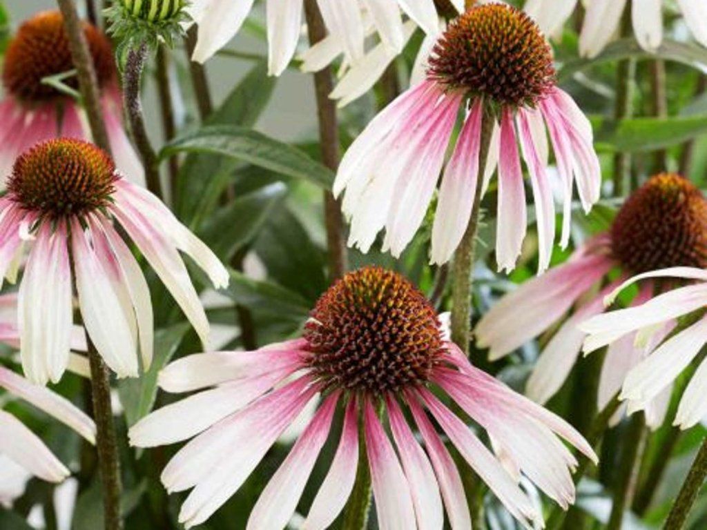 Echinacea 'Pretty Parasols' - eine neue Kultivarsorte des beliebten Rittersporns, die sich durch ein höheres Wachstum von bis zu 90 cm und üppige Blüte auszeichnet. Charakteristisch sind die kräftigen Stiele, die dem Wind sehr gut widerstehen und an ihren Enden auffällige Blüten tragen. Die Blüten zeichnen sich durch ihre weiß-rosa, zungenförmigen Blütenblätter aus, die einen wunderschönen Kontrast zur Umgebung bilden. Die Blütezeit ist von Juni bis September, abhängig von den Anbaubedingungen. Starke Stiele mit Blüten entspringen dichten Büscheln. Die Blätter der Echinacea sind dunkelgrün, ähnlich wie bei anderen Sorten der Purpur-Echinacea. Sie sind länglich und haben grob gesägte Ränder. Diese Pflanze passt mit ihrem Charakter hervorragend in Staudenbeete und naturnah gestaltete Gärten.