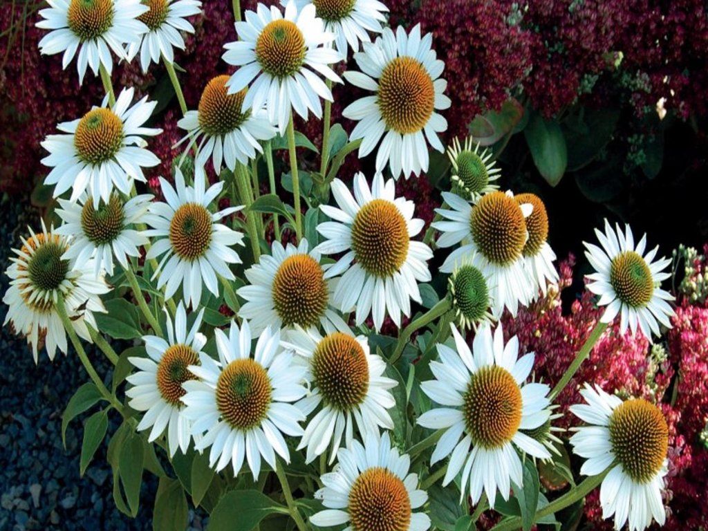 Echinacea ´Purity´ - Eine anspruchslose Staude, die aus dem mittleren Westen Amerikas und Europa stammt. Wird oft auch als Heilkraut verwendet. Sie wächst bis zu einer Höhe von 100 cm (abhängig von der gewählten Sorte). Die gesamte Gruppe strahlt in so vielen Farben, dass es fast unmöglich ist, sie hier alle aufzuzählen, ohne eine zu vergessen. Einige Sorten beginnen bereits Anfang Mai zu blühen, am häufigsten jedoch beginnen sie im Juli und blühen bis zum Spätsommer, also bis September. Anbau: Die Pflanze bevorzugt volle Sonne und gut durchlässigen, leicht feuchten Boden. Es ist ratsam, die Blüten nach dem Verblühen abzuschneiden oder abzubrechen, aber den Stiel für weitere Knospen aufzubewahren. Eine Kombination aus mehreren Sonnenhut-Sorten sieht wunderschön aus, zum Beispiel im Vordergrund niedriger grüner Sträucher usw.