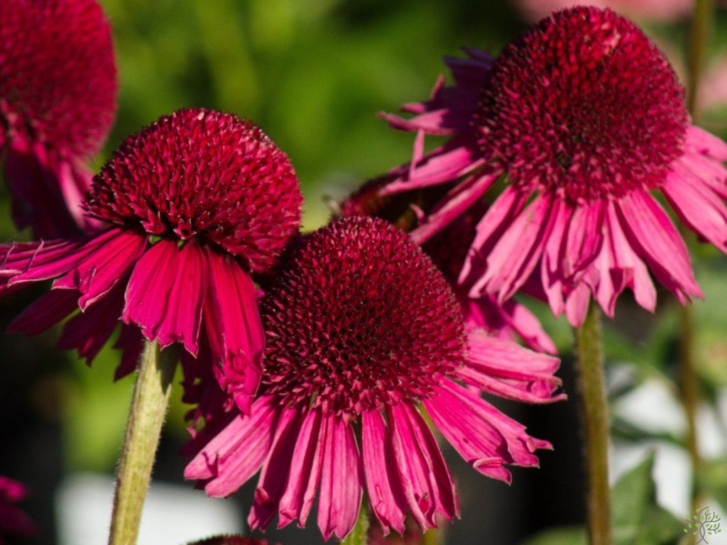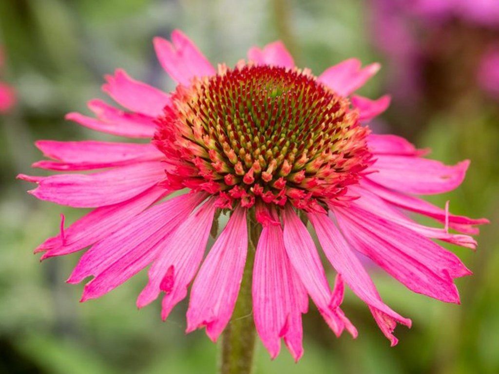 Echinacea DELICIOUS CANDY 'Noortdeli' - wahrscheinlich der auffälligste Kultivar des beliebten Sonnenhuts, der sich durch abnorm dichtes Wachstum und grell gefärbte Blüten auszeichnet. Sie erreicht eine Höhe von etwa 50 cm bei ähnlicher Breite. Charakteristisch sind die kräftigen Stiele, die dem Wind sehr gut widerstehen und an ihren Enden auffällige Blüten tragen. Die Blüten sind in einem attraktiven, tiefrosa Farbton gefärbt, der einen wunderschönen Kontrast zur Umgebung bildet. Sie sind ideal zum Schneiden und auch für Bestäuber äußerst attraktiv. Die Blütezeit ist von Juni bis September, abhängig von den Anbaubedingungen. Die Blätter der Echinacea sind dunkelgrün, ähnlich wie bei anderen Sorten der Purpur-Echinacea. Sie sind länglich und haben grob gesägte Ränder. Diese Pflanze passt mit ihrem Charakter hervorragend in Staudenbeete und naturnah gestaltete Gärten.