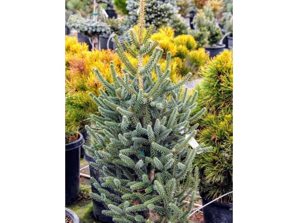 Spanische Tanne - attraktiver, langlebiger Nadelbaum aus Südspanien und Marokko. Sie wächst langsam und erreicht in der Natur eine Höhe von 20–30 Metern, unter unseren Bedingungen normalerweise weniger, etwa 15 m Höhe und 5 m Breite. Sie hat eine dichte, kegelförmige Krone und spezifische kurze, stachelige Nadeln, die spiralförmig um die Zweige wachsen und so ein deutlich „igeliges“ Aussehen erzeugen. Die Nadeln haben eine blaugrüne bis silbrige Farbe, was sie zu einem sehr dekorativen Baum macht. Die Zapfen sind aufrecht, zylindrisch, etwa 10–15 cm lang, anfangs grün und bei Reife braun. Geeignet als markanter Solitärbaum für größere Gärten oder Parks.