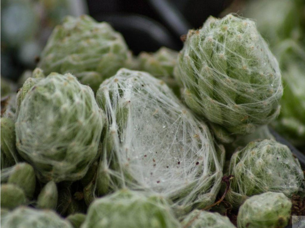 Spinnweb-Hauswurz 'Claerchen' - eine Sukkulentenart, bekannt für ihre charakteristischen Blätter und ihr dekoratives Aussehen. Sie hat kleine Rosetten, die aus dicht angeordneten Blättern bestehen. Die Blätter sind saftig, fleischig und haben normalerweise eine silbrig-grüne Färbung. Was bei dieser Sorte auffällt, sind die weißen Büschel, die an ein Spinnennetz erinnern und die Blätter bedecken. Gelegentlich blüht sie, aber ihre Hauptattraktion sind eher die Blätter als die Blüten. Die Blüten sind normalerweise rosa oder rot und wachsen auf langen Stielen über den Blättern. Einzelne Rosetten sterben nach der Blüte ab, bilden aber schnell viele neue Seitentriebe. Erreicht eine Höhe von 10 - 20 cm. Sie eignet sich hervorragend für Steingärten, Steinmauern, Behälter oder dekorative Tröge.