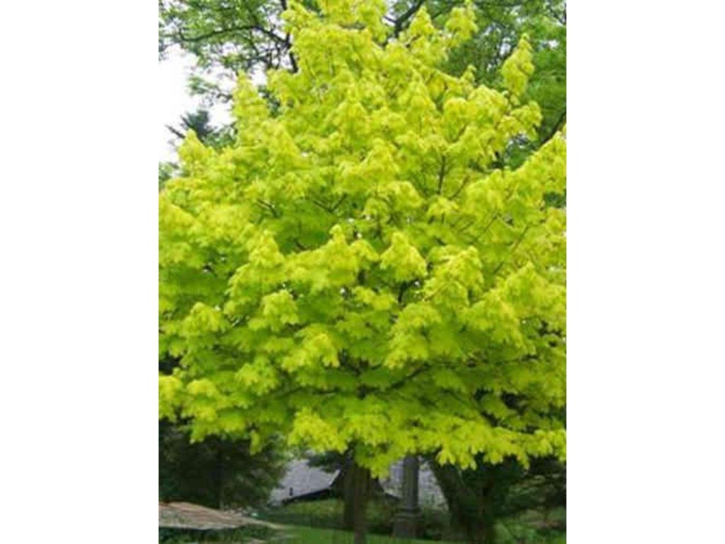 Spitzahorn 'Princeton Gold' - schnell wachsender, eher ungewöhnlicher Kultivar, der eine Höhe von 8-14 m und eine Breite von 6-12 m erreicht. In jungen Jahren bildet sie eine aufrechte, pyramidenförmige Krone, die sich im Laufe der Zeit zu einer breitkugeligen Form entwickelt. Die Blätter sind in der Knospenphase hellgelb-grün gefärbt, werden im Laufe der Saison dunkler und färben sich im Herbst orange oder goldgelb. Die Blattfarbe kann je nach Bodenazidität leicht variieren. Anfang März bis April erscheinen unscheinbare gelb-grüne Blüten noch vor dem Austreiben der Blätter, diese werden anschließend durch Früchte ersetzt. Er eignet sich als Solitärgehölz in jedem größeren Garten.