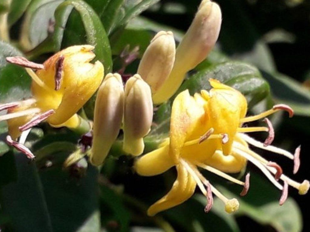 Spitzblättriges Geißblatt – immergrüne bis halbimmergrüne Kletterpflanze, die bis zu 4 m hoch wird. Längliche, lineal-lanzettliche Blätter sind dunkelgrün, leicht behaart und ledrig. Die Blüten sind kleiner, blühen paarweise an den Enden der Zweige, sind gelb und erscheinen von Mai bis Juni. Nach den Blüten bilden sich blau-schwarze Früchte, 6–7 mm lang. Die Samen sind elliptisch bis länglich, 4–4,5 mm lang. Die Pflanze benötigt eine Stütze.