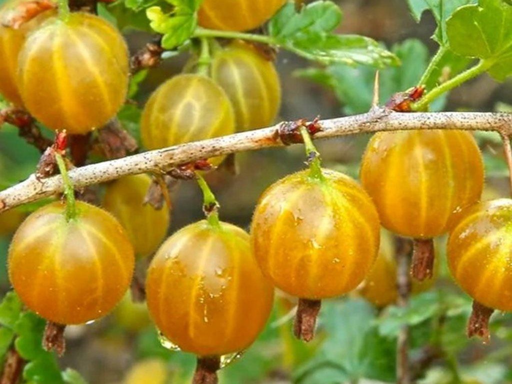 Stachelbeere 'Hinnonmaki Gelb' - eine aus Finnland stammende Sorte, die zu den am weitesten verbreiteten gelbfruchtigen Typen mit ausgezeichnetem Geschmack und zuverlässigem Ertrag gehört. Wächst mäßig stark, bildet einen kompakten, leicht ausladenden Habitus mit kräftigen Zweigen. Die Früchte sind mittelgroß bis groß, kugelförmig, mit gelber bis hellgrün-gelber Schale und saftigem Fruchtfleisch mit süß-saurer, zart fruchtiger Note mit einem Hauch von Aprikosen. Reift ab Mitte Juli. Die Triebe sind mäßig dornig, die Dornen sind kleiner und eher spärlich, so dass die Ernte einfach ist. Die Früchte eignen sich zum direkten Verzehr, für Kompott, Marmeladen oder zum Einfrieren und enthalten einen hohen Anteil an Vitamin C, Pektinen und Antioxidantien, die gut für das Immunsystem und die Verdauung sind. Er zeichnet sich durch ausgezeichnete Frostbeständigkeit aus, so dass er auch für kühlere Regionen geeignet ist. Die Sorte ist hochresistent gegen den amerikanischen Stachelbeermehltau.