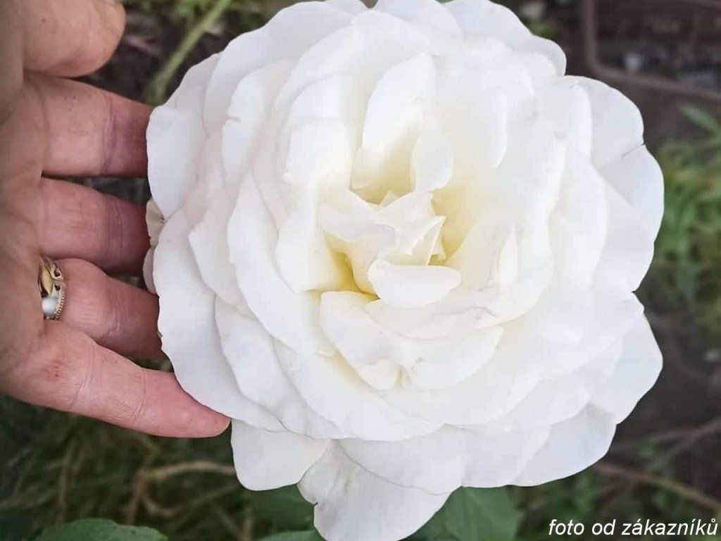 Hochstammrose 'Irina®' - eine moderne Teehybride aus der Züchtung von Rosen Tantau in Deutschland, die in der zweiten Hälfte der 2010er Jahre in das Sortiment aufgenommen wurde. Sie bildet einen aufrechten, gut verzweigten Strauch mit kräftigen Trieben, der unter den Bedingungen der Tschechischen Republik üblicherweise 0,8–1,2 m hoch und 0,6–0,8 m breit wird. In der Hochstamm-Variante wird die Krone durch Schnitt in ähnlichen Dimensionen gehalten und bildet eine übersichtliche, regelmäßige Form am Eingang oder auf der Terrasse. Die Blätter sind dunkelgrün, glänzend und ledrig, die Stiele tragen übliche Dornen. Von Juni bis Oktober wiederholt sich die Blüte in Wellen. Aus kugelförmigen Knospen öffnen sich sehr große, dicht gefüllte Blüten mit einem Durchmesser von etwa 12–14 cm in reinweißem Farbton, der im Abendlicht porzellanartig wirkt. Der Duft ist intensiv, rosenartig mit einem Hauch von Zitrusfrüchten, und die Sorte wird gerade wegen ihrer Parfümierung geschätzt. Bei dicht gefüllten Blüten ist der Zugang zu Pollen begrenzt, sodass Bestäuber die Blüten eher nach vollständiger Öffnung aufsuchen. Die Blüten erscheinen überwiegend einzeln an längeren Stielen, daher ist die Rose auch als Schnittblume geeignet und behält in der Vase ihre Form. Die Sorte erscheint auch in Übersichten ausgezeichneter Rosen und wird mit einer Silbermedaille vom Wettbewerb in Rom aufgeführt. In Beeten harmoniert sie gut mit Lavendel, Katzenminze, Salbei, Frauenmantel und feinen Ziergräsern, oder mit Rosen in Cremetönen für einen ruhigen Kontrast. Wir bieten sie als Hochstamm-Variante an.