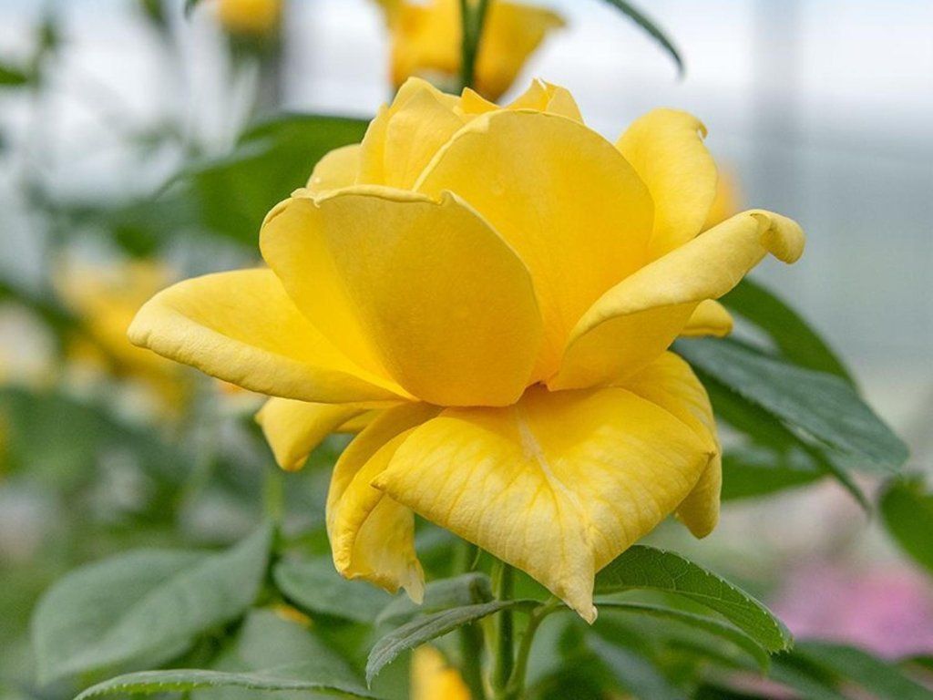 Hochstammrose 'Landora' - großblütige Teerose. Sie hat große (bis zu 12 cm im Durchmesser), leuchtend gelbe, gefüllte Blüten. Der Duft der Blüten ist sehr angenehm, intensiv. Die Blüten selbst halten sich längere Zeit an der Pflanze. Sie blühen bereits im Mai, eine weitere Welle folgt im Sommer. Sie sind zum Schnitt geeignet. Die Sorte ist gut resistent gegen Sternrußtau und Mehltau.