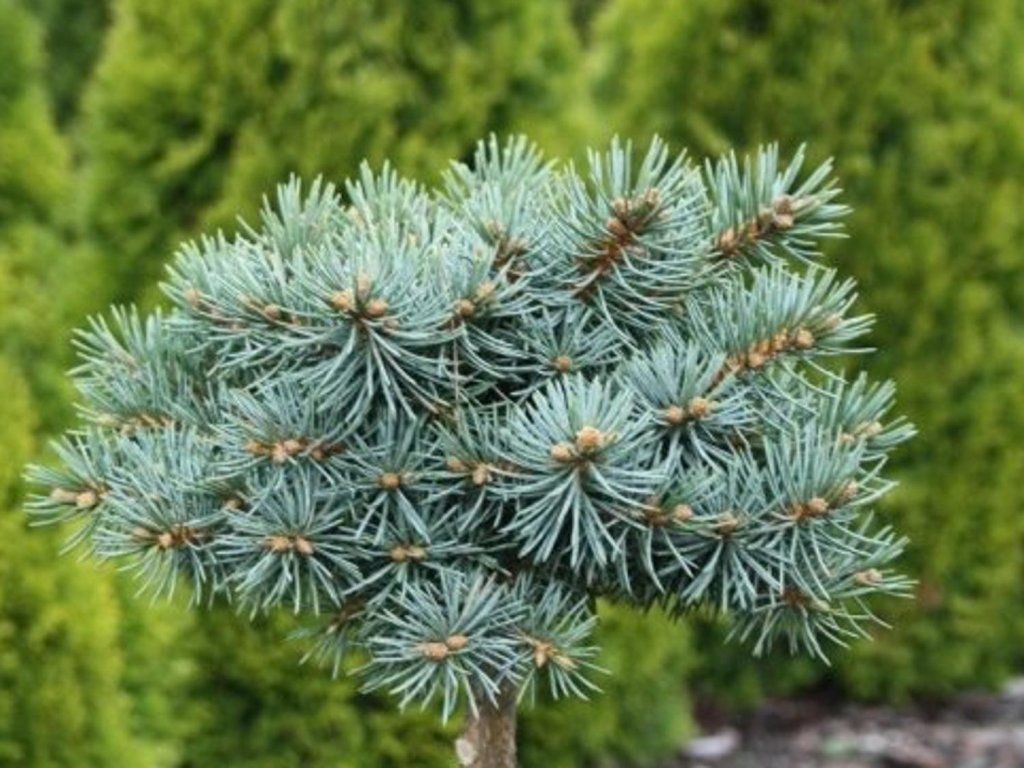 Blaufichte 'Charming Chub'- eine dichte, kompakte Sorte der Blaufichte, die sich auch für kleinere Gärten eignet. Die Nadeln sind eher kurz, blaugrün bis silbern gefärbt und an den Spitzen spitz zulaufend. Er wächst sehr langsam, die jährlichen Zuwächse betragen nur 2 – 3 cm. Im Alter von zehn Jahren erreicht er eine Höhe von 20 cm bei einem Durchmesser von 30 cm. Im ausgewachsenen Zustand erreicht er eine Höhe von 40 cm und eine Breite von 70 cm, je nach Wachstumsbedingungen. Er ist sehr frostbeständig und anspruchslos im Anbau. Deshalb werden ihn sowohl Anfänger als auch erfahrene Gärtner lieben. Sie zeichnet sich durch schnelles Wachstum, ausgezeichnete Bodenbedeckung und lange, anhaltende Blüte aus. Wenn Sie eine Zwergkonifere suchen, die Ihren Garten dezent färbt, dann ist die Blaufichte die richtige Wahl.