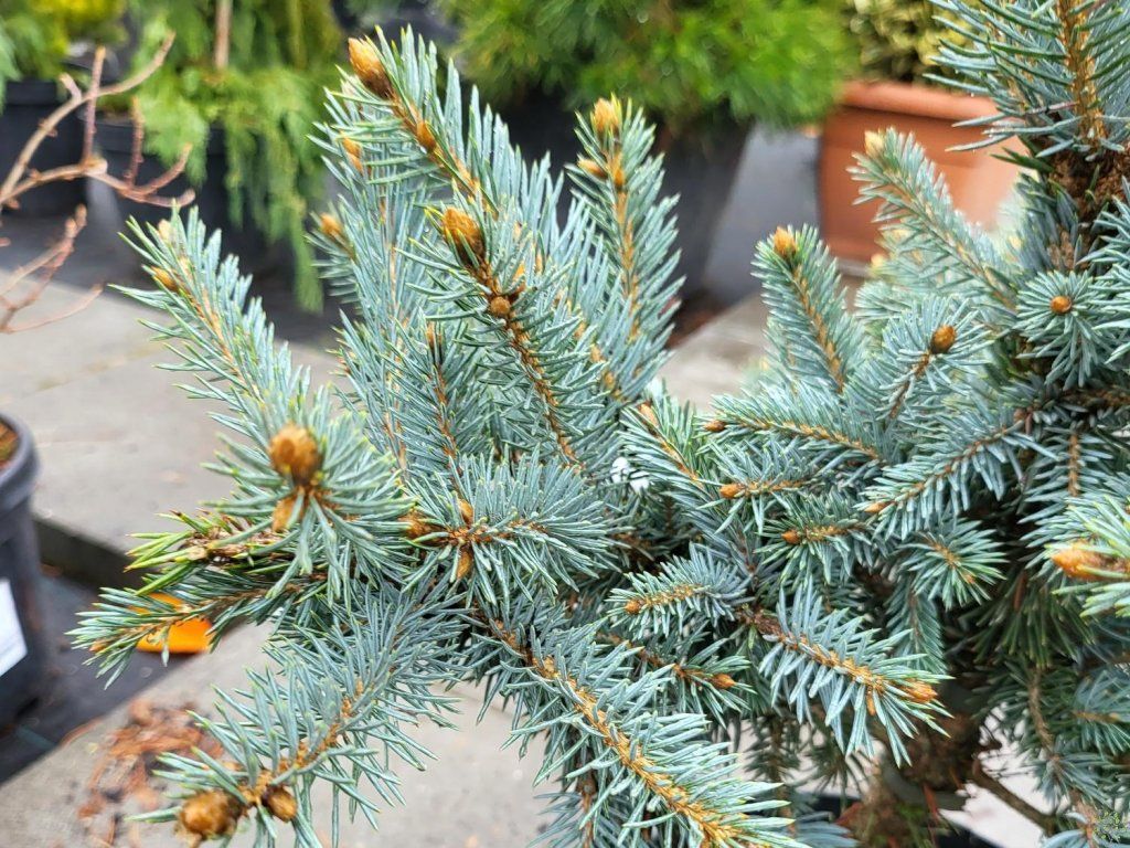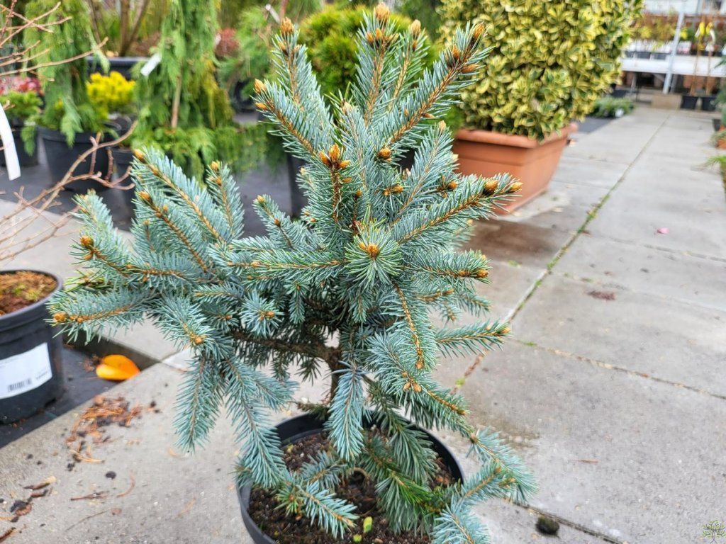 Blaufichte 'Donna's Rainbow' - eine interessante Sorte, bekannt für ihre bunte Färbung und ihr attraktives Aussehen. Im Laufe von 10 Jahren erreicht sie eine Höhe von 10 m. Der Habitus ist dicht, kegelförmig. Die Nadeln sind relativ kurz, grün mit einem bläulichen Schimmer. Sie ist die ideale Wahl für Ziergärten, Steingärten oder als Solitärgehölz, das Farbe und Textur in den Raum bringt.
