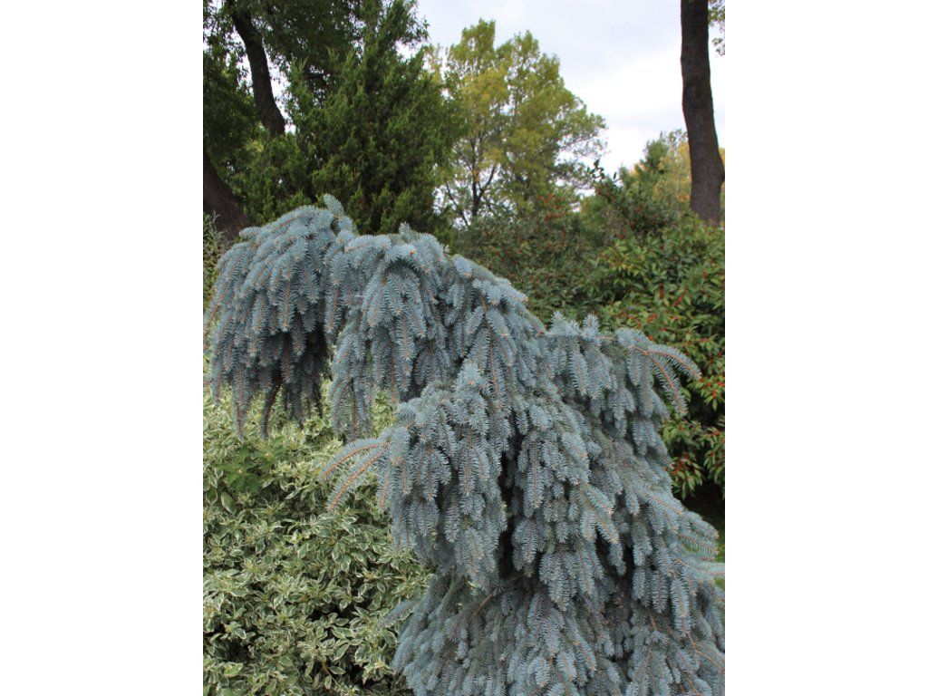 Blaufichte 'Glauca Pendula' - eine Sorte mit unregelmäßigem, aufrechtem Wuchs, die in 15 Jahren eine Höhe von 7 m bei einer Breite von 3 m erreicht. Die jährlichen Zuwächse können bis zu 30 cm betragen, abhängig von Pflege und Wachstumsbedingungen. Die Äste hängen frei und unregelmäßig herab. Die Nadeln sind sichelförmig, haben eine silbrig-blaue Färbung, die im Frühjahr und Frühsommer am intensivsten ist, sie sind kurz, steif und stachelig. Geeignet für normale Böden in voller Sonne. Die Zapfen hängen frei am Baum und haben eine hellbraune Färbung. Die Pflanze ist als Solitär geeignet.