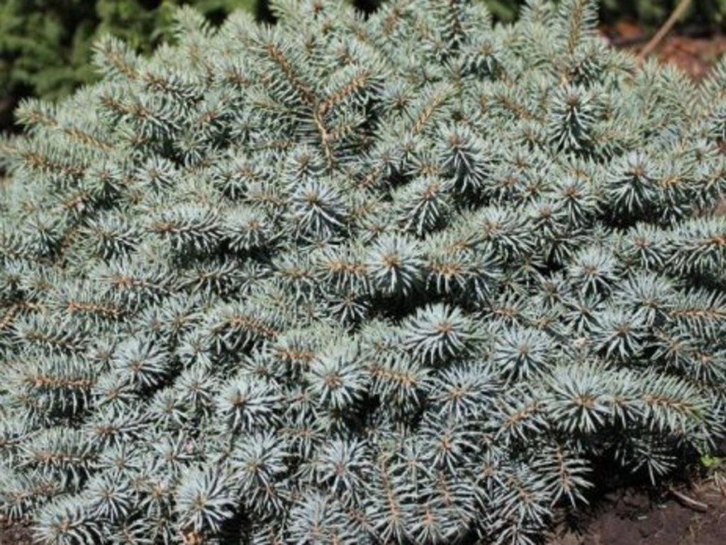 Blaufichte 'Kloster Maria Stern' - Fichte mit dichtem und halbkugelförmigem Wuchs, die eine kissenförmige Gestalt bildet. Mit 10 Jahren erreicht sie eine Höhe von 0,3 - 0,5 m und eine Breite von 1,2 - 1,5 m. Die Nadeln sind kurz, hart und haben beim Austrieb eine silbrigblaue Färbung, die sich später in blaugrüne Töne wandelt. Kommt in der Gruppenpflanzung mit anderen Nadelgehölzen oder als Solitär im Steingarten zur Geltung.