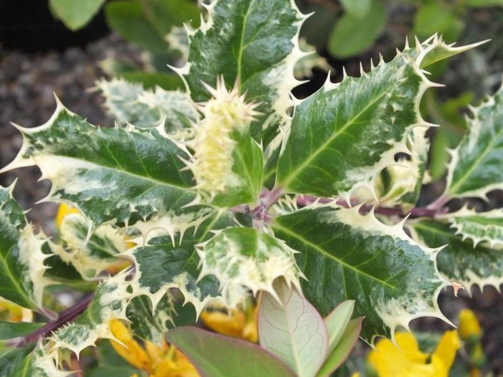 Stechpalme 'Ferox Argentea' - männliche Sorte, immergrüner Strauch aus europäischen Waldrändern, geschätzt für seine Winterstruktur und sein widerstandsfähiges, ledriges Laub. Die Sorte 'Ferox Argentea' gehört zur Gruppe der Ferox-Sorten mit außergewöhnlich dornigen Blättern, die einen igelartigen Eindruck hinterlassen, und trägt gleichzeitig eine cremeweiße Panaschierung, die bei jungen Trieben am ausgeprägtesten ist. Im Mai und Juni blühen kleine weiße Blüten, wichtig für Bestäuber. Diese Sorte ist männlich und bildet keine Zierbeeren, sondern kann als Bestäuber für weibliche Stechpalmensorten in der Umgebung dienen. In unseren Gärten erreicht sie eine Höhe von ca. 3–4 m und eine Breite von 1,5–2,5 m. Sie wächst langsam bis mittelmäßig schnell und wird dank ihrer dichten Verzweigung für blickdichte Hecken, Sicherheitsbepflanzungen und als markanter Solitär in Vorgärten verwendet. Panaschierte Blätter bringen Licht in den Schatten und lassen sich gut mit dunkelblättrigen Berberitzen, Eiben, Farnen und schattenliebenden Stauden kombinieren, während die Dornen die Schutzwirkung der Bepflanzung erhöhen.
