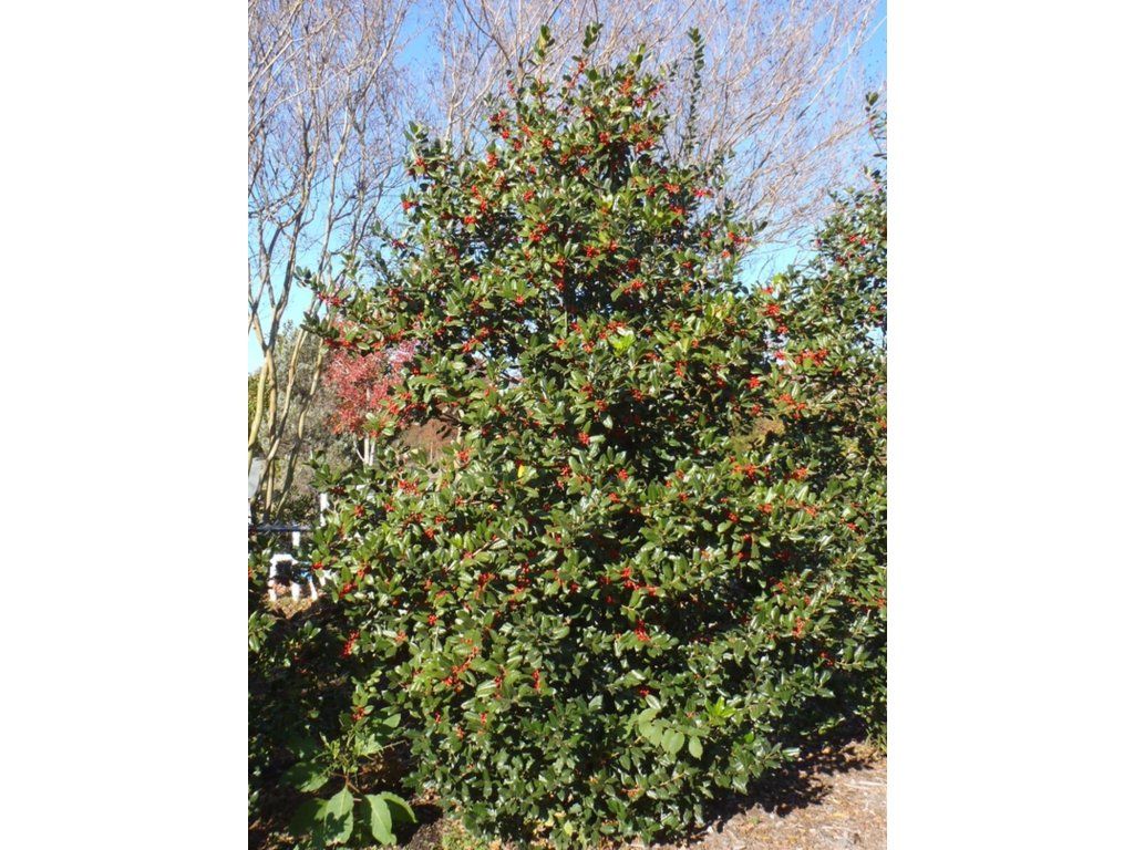 Ilex 'Nellie R. Stevens' - eine amerikanische Sorte, die aus der Kreuzung von Ilex aquifolium und Ilex cornuta hervorgegangen ist und sich durch ihre Vitalität und Fruchtbarkeit auszeichnet. Er bildet einen dichten, immergrünen Strauch bis hin zu einem kleinen Baum mit kegelförmigem Habitus, der im Erwachsenenalter normalerweise eine Höhe von 4–6 m und eine Breite von 2,5–4 m erreicht. Die Blätter sind dunkelgrün, ledrig, glänzend und haben deutliche Dornen am Rand. Die Blüten sind klein, weiß, erscheinen im Mai bis Juni und sind bienenfreundlich. Die Früchte sind kugelförmig, tiefrot, reifen im Herbst und bleiben oft bis in den Winter am Strauch. Die Sorte ist teilweise selbstfruchtbar, dennoch erhöht die Anwesenheit einer weiteren Stechpalme in der Nähe den Fruchtansatz. Sie findet Anwendung in Hecken, Sichtschutzpflanzungen und als Solitär in Gärten und Parks. Der dichte, gut verzweigte Habitus ermöglicht den Einsatz in offenen und geschnittenen Hecken, in Gruppen mit Nadelgehölzen oder als Solitär. Die Dornen an den Blättern sind bei jungen Trieben ausgeprägter, daher eignet sie sich an stark frequentierten Stellen eher als Hintergrundbepflanzung.
