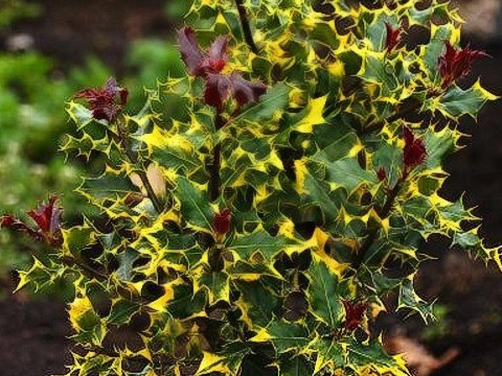 Ilex aquifolium 'Red Tips' - männliche Sorte, die eine Höhe von 2,5 m und eine Breite von 1 m erreicht. Beeindruckt mit seinen gelb panaschierten Blättern. Die Blätter sind scharf gezähnt, am Rand sägezahnartig und stachelig. Auf den Blättern dominiert ein frisches Grün, das durch eine gelbe Sprenkelung deutlich verschönert wird. Bildet keine Beeren, dient als Bestäuber. Benötigt einen sonnigen oder halbschattigen Standort und feuchten Boden.