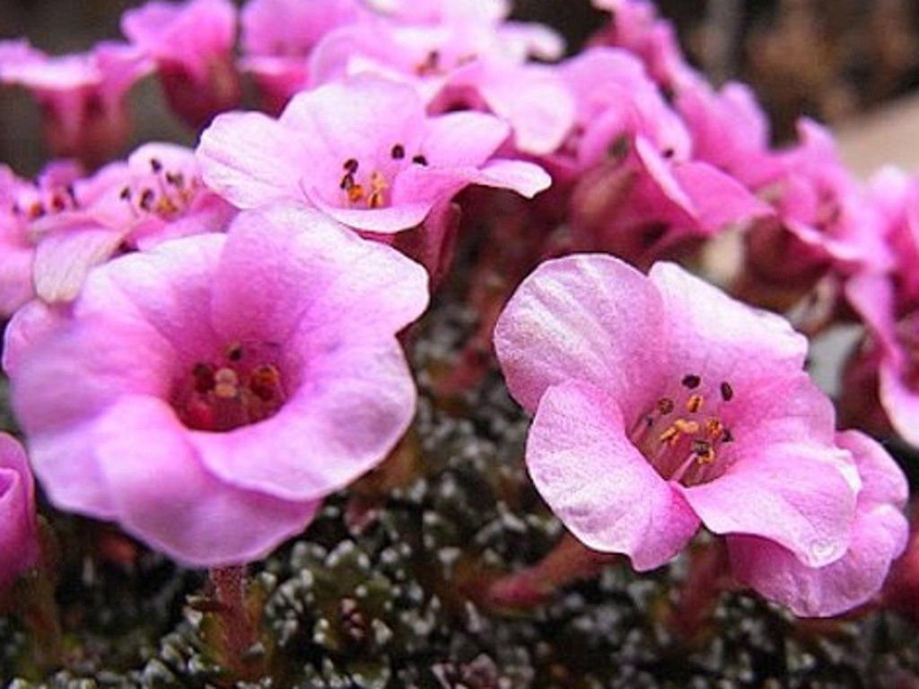 Steinbrech 'Laka' - sehr schöner Polsterbildner, der niedrige, 5 cm hohe, langsam wachsende grüne Polster bildet, aus denen hellrosa Blüten hervorragen. Blüht recht früh, bereits von März bis April.