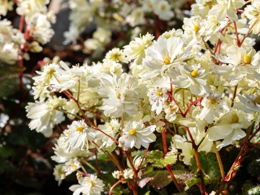 Saxifraga cortusifolia Dancing Pixies 'Tweeny' - eine Kultivarpflanze, die aus einer Art stammt, die in feuchten, schattigen Felsen Ostasiens beheimatet ist und in einem Gebirgsklima auf kühlen, humosen Böden wächst. Unter unseren Bedingungen bildet 'Tweeny' niedrige, kompakte Horste, die zur Blütezeit etwa 20–25 cm hoch und 30–40 cm breit sind. Aus den grundständigen Rosetten wachsen runde bis handförmig gelappte Blätter, dunkelgrün und glänzend, mit einem fein gezähnten Rand, die den größten Teil des Jahres einen sattgrünen Teppich im Halbschatten bilden. Von Oktober bis November, bei mildem Winter auch etwas länger, erscheinen über den Blättern schlanke, leicht rötliche Stängel mit lockeren Blütenrispen. Die Blüten sind cremeweiß bis fast reinweiß, mit vollen, breiteren Blütenblättern, die sich scharf vom dunklen Laub abheben. Im Detail sind die Staubblätter mit dunkler Spitze zu erkennen. In einer größeren Gruppe wirkt der Blütenstand wie ein zarter heller Schleier und bietet gleichzeitig späte Nahrung für Bienen und andere Bestäuber, zu einer Zeit, in der die meisten Stauden bereits verblüht sind. Die Ursprungsart Saxifraga cortusifolia wird weder als giftig noch als essbar beschrieben. Daher werden die dekorativen Kultivare der Reihe Dancing Pixies, einschließlich 'Tweeny', ausschließlich wegen des Laubes und der Herbstblüten verwendet. 'Tweeny' integriert sich gut in Wald- und Heidekraut-Ecken, in den Unterwuchs unter Sträuchern, an schattige Felsränder sowie in Herbstkübel auf Balkon oder Terrasse, wo sie Besenheide, Farne, Purpurglöckchen, Funkien, Seggen und andere schattenliebende Stauden sanft begleitet.