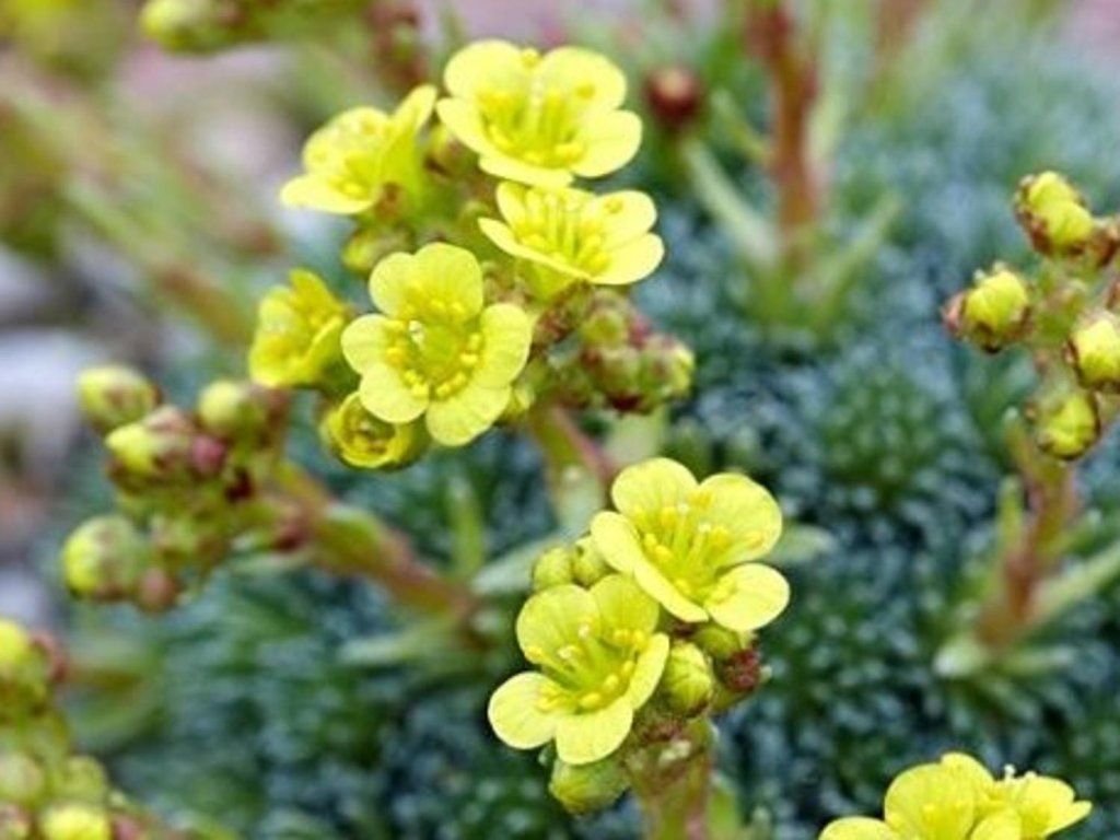 Steinbrech ferdinandi coburgi var. rhodopaea - eine niedrig wachsende, immergrüne Staude, die eine Höhe von etwa 5 - 10 cm erreicht. Bildet dichte, flache und feste Polster. Die Blätter sind länglich, lanzettlich und kreidig grau-grün. Sie wachsen in bodennahen Rosetten. Im April blüht sie mit kleineren gelben Blüten, die in einem runden Blütenstand angeordnet sind und von kurzen Stielen getragen werden. Dieser Steinbrech eignet sich für Steingärten, Staudenbeete oder Kübel.