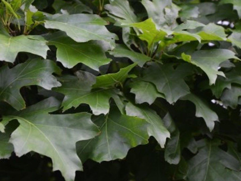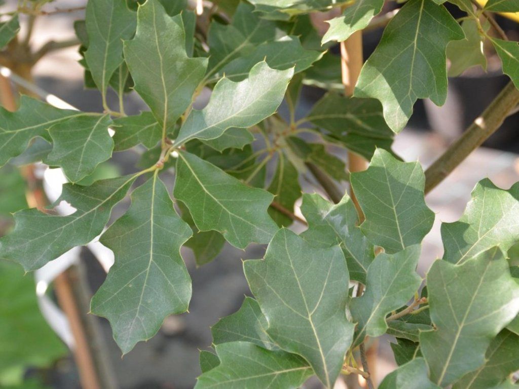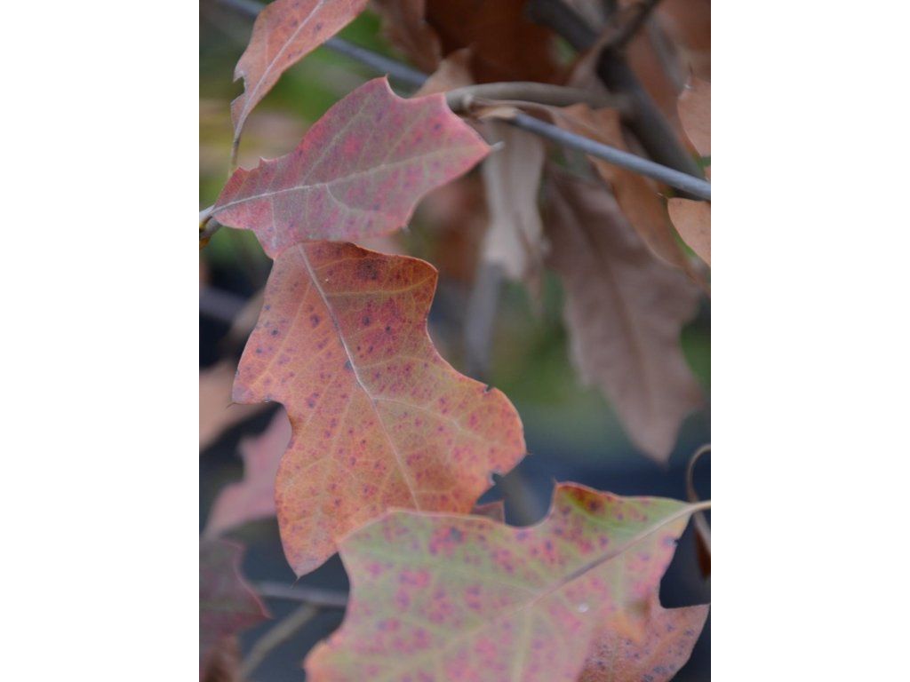Steineiche 'Tromp Ball' - kStrauch oder kleiner Baum, der bis zu 2 m hoch wird. Er/Sie hat eine lockere, unregelmäßige Form, ist aber dennoch dicht.Eine glatte, unregelmäßige Form, aber dennoch dicht. Die Blätter sind oval oder verkehrt-eiförmig, sehr unkonventionell geformt. Sie sind gekürzt. Ihre Farbe ist dunkelgrün und darunter glänzend graugrün oder weißlichgrün. Im Herbst färben sich die Blätter intensiv rot. Die Blütenstände sind unscheinbar. Die darauf folgenden Früchte sind ovale Eicheln. Sie sind in einer graugrünen Hülle verborgen.