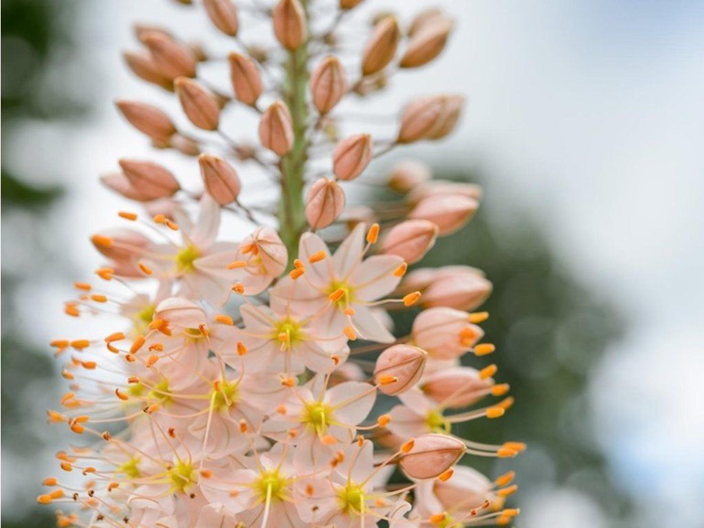 Eremurus 'Romance' - eine Gartenhybride aus Arten aus den Halbwüsten und Steppen Zentralasiens, wo die Sommer trocken, die Böden mineralisch und die Winter kalt sind. Die Pflanze bildet ein abgeflachtes Speicherorgan mit einem Fächer aus zarten, fleischigen Wurzeln, die an einen Seestern erinnern, aus dem im Frühjahr eine bodennahe Rosette aus schmalen, graugrünen Blättern wächst. Die Sorte 'Romance' gehört zu den feiner gefärbten Sorten, die auf kräftigen, aufrechten Stielen im Mai und Juni schlanke Ähren von etwa 40–60 cm Länge tragen, die aus vielen sternförmigen Blüten bestehen. Die Farbe reicht von aprikosenrosa bis lachsfarben, die Staubbeutel verleihen dem Blütenstand einen warmen, goldenen Akzent. Nach der Blüte zieht sich die Pflanze allmählich zurück und ruht im Sommer, was für die Kultivierung entscheidend ist. Im ausgewachsenen Zustand bildet sie einen Horst von etwa 120–150 cm Höhe und 60–80 cm Breite und wirkt im Beet als vertikale Achse zwischen niedrigeren Stauden. Lässt sich gut mit Ziergräsern, Salbei, Katzenminze, Schafgarbe oder blauen Mohnblumen kombinieren, die Farbe und Struktur ergänzen. Das Blütenrispen eignet sich zum Schnitt und zum Trocknen und liefert gleichzeitig Pollen und Nektar zu einer Zeit, in der die Bestäuberaktivität im Garten ihren Höhepunkt erreicht. Insgesamt ist diese Sorte ein schönes Element für Gärten, sie bringt Farbe und ein exotisches Aussehen in jeden Garten.