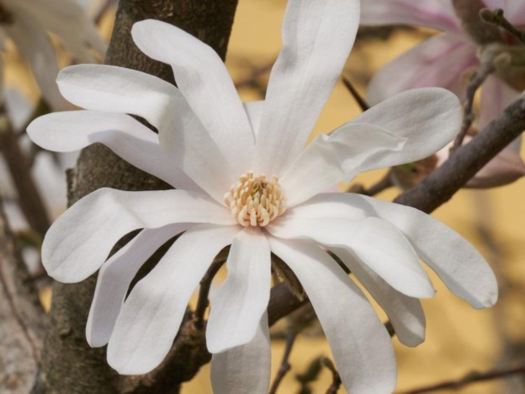 Sternblühende Magnolie 'Waterlily' - eine japanische Magnoliensorte, die wegen ihres kompakteren Wuchses und ihrer seerosenartigen Blüte ausgewählt wurde. Sie wächst langsam, verzweigt sich dicht und bildet einen aufrechten bis leicht pyramidenförmigen Strauch, der im Erwachsenenalter normalerweise 2–4 m × 2–4 m erreicht. Die Knospen sind seidig behaart und werden bereits im Sommer des Vorjahres angelegt. An den kahlen Zweigen öffnen sich im März bis April reinweiße, stark duftende Blüten, oft mit einer größeren Anzahl schmaler Blütenblätter, sodass sie in voller Blüte wie eine kleine Seerose wirken. Die Sorte blüht in der Regel 1–2 Wochen später als die gewöhnliche Magnolia stellata, und dadurch wird das Risiko von Frostschäden an den Blüten reduziert. Die Blätter sind schmal elliptisch, im Sommer grün und verfärben sich im Herbst gelb. In der Komposition kommt sie als Solitärpflanze auf der Terrasse, an einer wärmespeichernden Mauer oder in einer Gruppe mit Rhododendren, Azaleen, Hortensien und feinen Gräsern zur Geltung, wo die Frühlingsblüte den noch schlafenden Garten erhellt. Eine einzelne Blüte ist etwa 8–12 cm groß und öffnet sich bei wärmerem Wetter zu einer breiten Schale. Nach der Blüte können Sammelbalgfrüchte mit roten Samen entstehen, die einen feinen Herbstakzent setzen, auch wenn der Hauptzierwert die Frühlingsblüte ist.