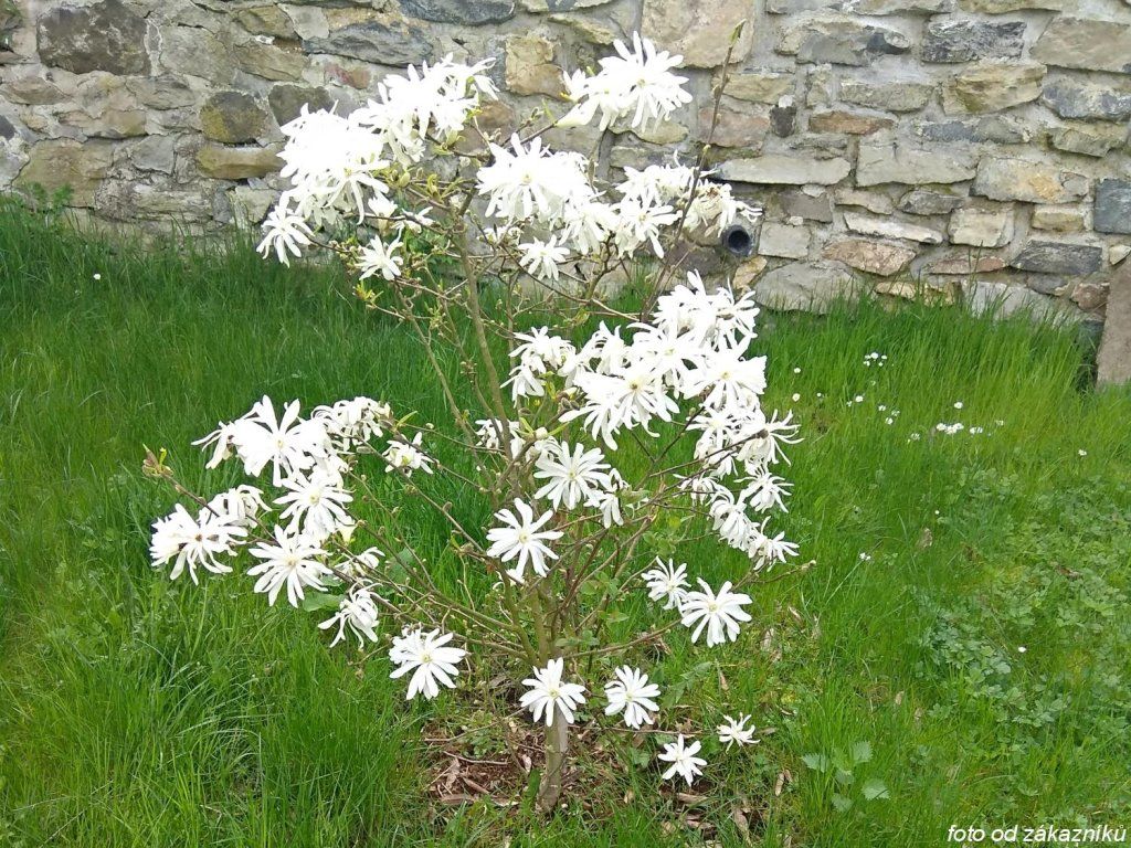 Stern Magnolie - Stern Magnolie, stammt aus Japan und gehört in der Kultur zu den zuverlässigsten früh blühenden Magnolien. Sie wächst langsam und entwickelt sich meist zu einem mehrstämmigen Strauch bis kleinen Baum mit runder Krone, der im Erwachsenenalter etwa 2–4 m hoch und ähnlich breit wird. Noch vor dem Austreiben der Blätter öffnen sich an den Enden kurzer Zweige sternförmige Blüten, meist weiß, manchmal aus rosafarbenen Knospen, üblicherweise 8–10 cm breit. Der Duft ist zart bis mittel, am besten entfaltet er sich an warmen Tagen. Nach dem Abblühen erscheinen hellgrüne Blätter, die sich im Herbst gelb verfärben. Bei warmem Sommerwetter können sich Sammelbalgfrüchte bilden, die sich im Herbst rosa bis rot färben und nach dem Öffnen tiefrote Samen zeigen. In der Gartengestaltung eignet sie sich als Solitärpflanze auf der Terrasse, im Vorgarten und in japanisch angelegten Beeten mit Ahornen, Pieris oder immergrünen Sträuchern, die die Frühlingsblüten an kahlen Zweigen hervorheben.