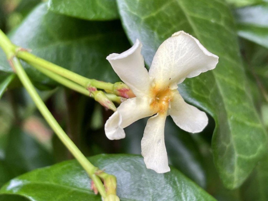 Trachelospermum asiaticum 'Chili and Vanilla' - panaschierte Form des sogenannten Sternjasmin, obwohl es kein echter Jasmin ist. Er bildet immergrüne, rankende Triebe, die sich selbst um Stützen wickeln und allmählich verholzen. Die Blätter sind gegenständig, ledrig, glänzend, normalerweise 4–8 cm lang, mit unregelmäßiger cremefarbener Panaschierung, im Winter können sie bronzefarbene Töne annehmen. Von Juni bis August öffnen sich an den Triebspitzen sternförmige Blüten von etwa 2 cm, cremeweiß bis vanillegelb, in kleinen Blütenständen gruppiert, stark duftend und bienenfreundlich. Nach der Blüte können sich schmale Kapseln bilden, die kleinen Paprikaschoten ähneln, anfangs grün, später rot werdend, ungenießbar. Der milchige Saft kann nach dem Schnitt die Haut reizen und die Pflanze gilt bei Verzehr als giftig. Im Garten findet sie Verwendung an Pergolen, Gittern und Drahtgerüsten an Mauern, wo sie im Sommer den Sitzplatz mit Duft erfüllt und für den Rest des Jahres eine grüne Kulisse bildet. In der Komposition harmoniert sie gut mit Lavendel, Salbei, Rosmarin und Ziergräsern auf der Sonnenseite, oder mit Farnen im lichten Halbschatten.