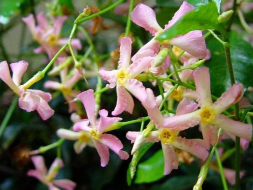 Jasmine 'Stern von Sizilien' - undEine attraktive Kletterpflanze, die eine Höhe von 9 m und eine Breite von 3 m erreicht. Die Lianen sind dicht mit dunkelgrünen Blättern besetzt, die sich im Herbst oft bronzefarben verfärben. Von Juni bis August bringt sie sternförmige Blüten in zarten Rosatönen mit gelber Mitte hervor. Die Blüten duften außerdem angenehm. Sie ist frostbeständig bis -10 °C, bei stärkeren Frösten sorgen wir für Winterschutz.