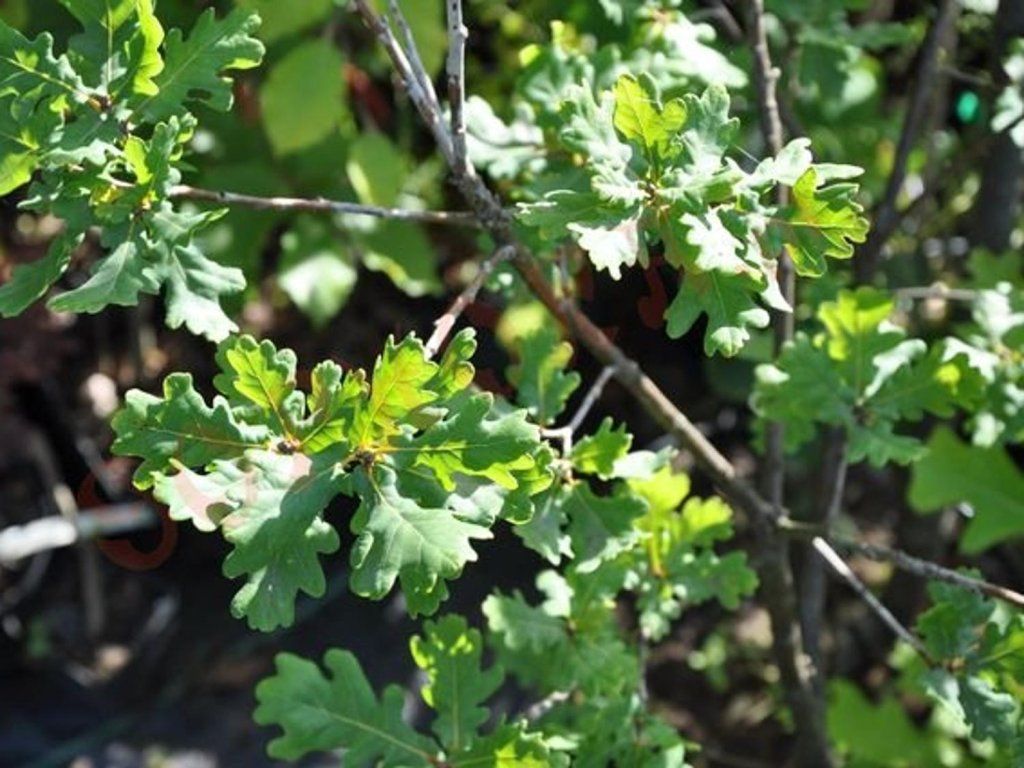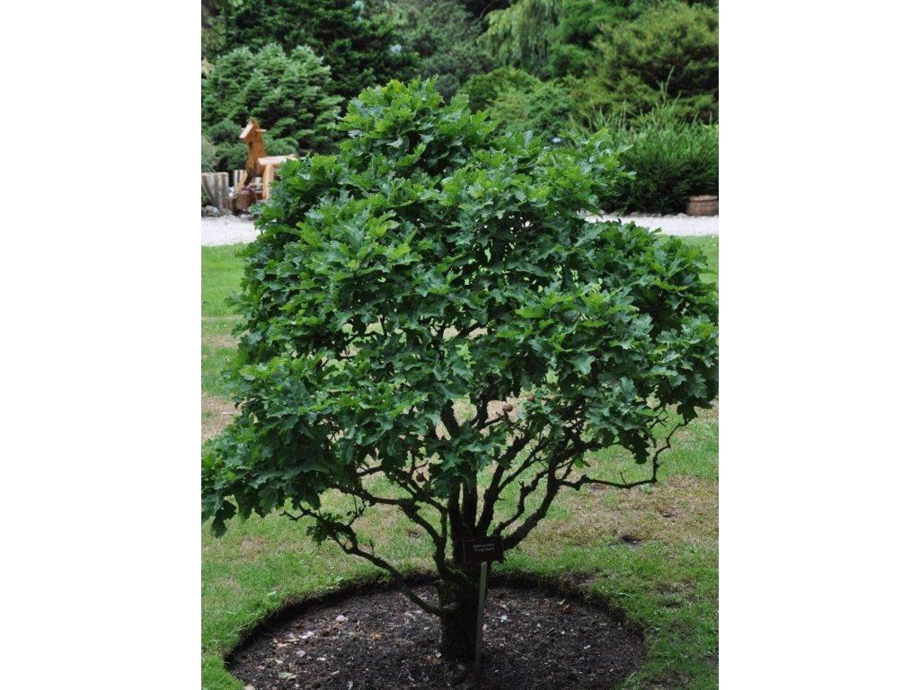 Sommereiche 'Blue Gnome' - niedrige Sorte, erreicht eine Höhe von nur 3m bei einer Breite von 2,5m. Wächst sehr langsam, die Krone ist unregelmäßig dicht. Die Blätter sind in Büscheln angeordnet und haben eine grau-grüne Farbe.