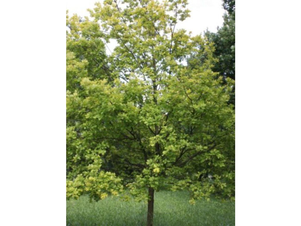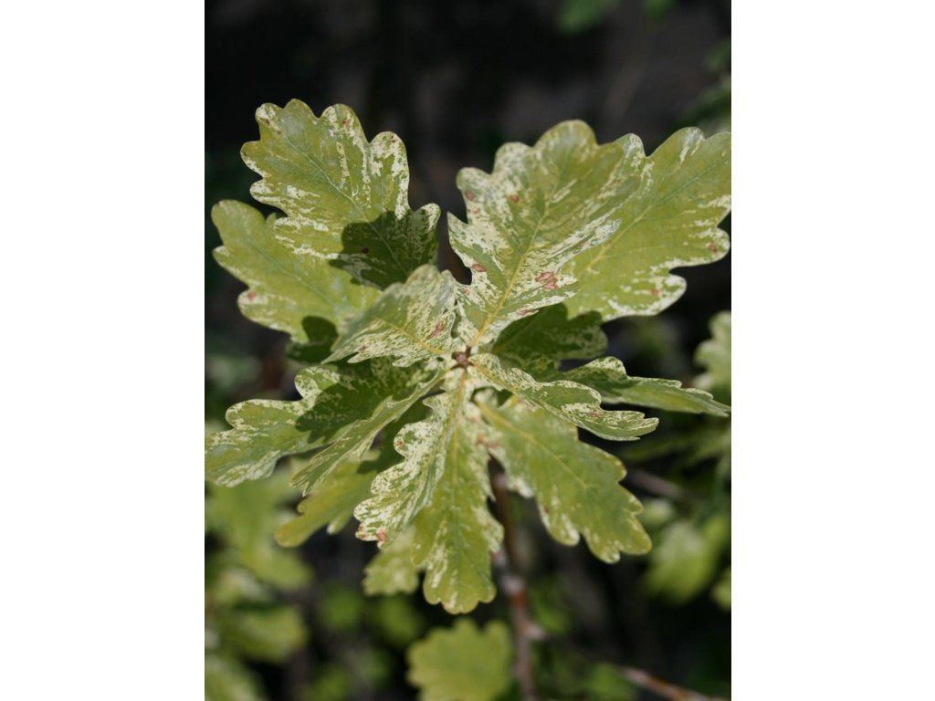 Zier-Eiche 'Castle Howard' - Die Sorte 'Castle Howard' wird hauptsächlich wegen ihrer ungewöhnlichen Blattpanaschierung angebaut, die wie gestreutes Licht in der Krone wirkt. Die Blätter sind oval bis eiförmig, flach gelappt mit abgerundeten Lappen, oft 8–14 cm lang. Die Oberseite ist mittelgrün und unregelmäßig mit weißer oder silbriger Zeichnung gepunktet oder gesprenkelt, die Unterseite ist heller. Beim ersten Austrieb im Frühjahr wirken die Flecken zart, nach dem Austrieb im Sommer können sie ausgeprägter sein, stellenweise fast weiß. Einjährige Triebe sind rotbraun, was die Panaschierung noch verstärkt, die ältere Rinde wird allmählich dunkler und rissig in Längsplatten. Die Krone ist breit kuppelförmig bis leicht abgeflacht, in der Jugend regelmäßiger, später natürlich ausgebreitet und spendet Schatten. Im Mai erscheinen unscheinbare männliche Kätzchen, und nach der Bestäubung bilden sich Eicheln, die im September bis Oktober reifen. Die Früchte sind Nahrung für Vögel und Kleinwild und verleihen dem Garten einen natürlichen Rhythmus in der späten Jahreszeit. Die Sorte eignet sich als Solitärgehölz auf Rasenflächen, in repräsentativen Vorgärten und in Parkkompositionen. Passt gut zu dunkelgrünen Nadelgehölzen, Buchen, Hainbuchen oder Ziergräsern, die die hellere Blattzeichnung unterstreichen.