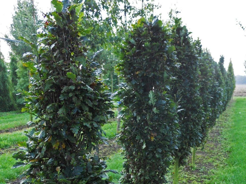 Sommereiche 'Menhir' - eine Zwergform mit geringem und kompaktem Wuchs. Sie hat einen sehr geringen jährlichen Zuwachs, wodurch sie eine sehr dichte, spinnenförmige Krone bildet. Sie erreicht eine Höhe von etwa 3 Metern, ihr Kronendurchmesser ist gering, der Baum behält sein säulenförmiges Wachstum. Die Blätter sind kleiner, dunkelgrün, glänzend, von unten heller, ledrig. Er ist gut frostbeständig. Geeignet für enge Straßen und kleine Gärten.