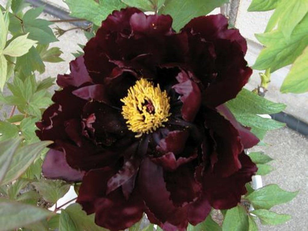 Bauernpfingstrose 'Dunkelweinrot einfach' - im Sortiment unter dem beschreibenden Namen für eine Sorte mit dunkelweinrot-roten, einfachen Blüten geführt. Sie gehört zur Gruppe der baumartigen Pfingstrosen, die in China durch lange Auswahl und Kreuzung entstanden sind und im Gegensatz zu krautigen Pfingstrosen nicht jedes Jahr zum Boden zurückziehen, sondern einen laubabwerfenden Strauch mit verholzenden Trieben bilden. Im Erwachsenenalter erreicht sie normalerweise eine Höhe und Breite von etwa 1,3–1,5 m. Die Blätter sind tief geteilt, dunkelgrün und färben sich im Herbst oft gelb bis goldgelb. An den Enden reifer Zweige öffnen sich im Mai bis Juni schalenförmige Blüten, meist etwa 12–15 cm groß, in samtiger Weinrot-Farbe. In der Mitte verbleibt ein Kranz gelber Staubgefäße mit Pollen für Bestäuber, und die Blüten duften oft leicht. Im Garten eignet sie sich als Solitärpflanze am Eingang, vor dunklem Nadelholzhintergrund oder in einem gemischten Staudenbeet mit Christrosen, Schwertlilien und Zierlauch. Säfte können bei empfindlichen Personen die Haut reizen und beim Verzehr können Pflanzenteile reizend sein.