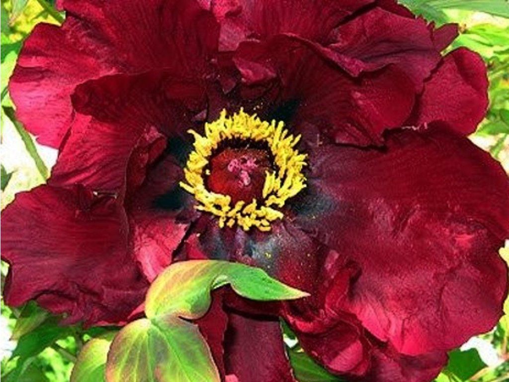 Baumpfingstrose 'Hatsugarasu' - laubabwerfender Strauch, der eine Höhe von 80-150 cm erreicht. Die Blüten sind groß, halbgefüllt, von satter, dunkelweinroter Farbe. Der Blütendurchmesser beträgt 15-20 cm. Sie erscheinen im Mai und Juni.