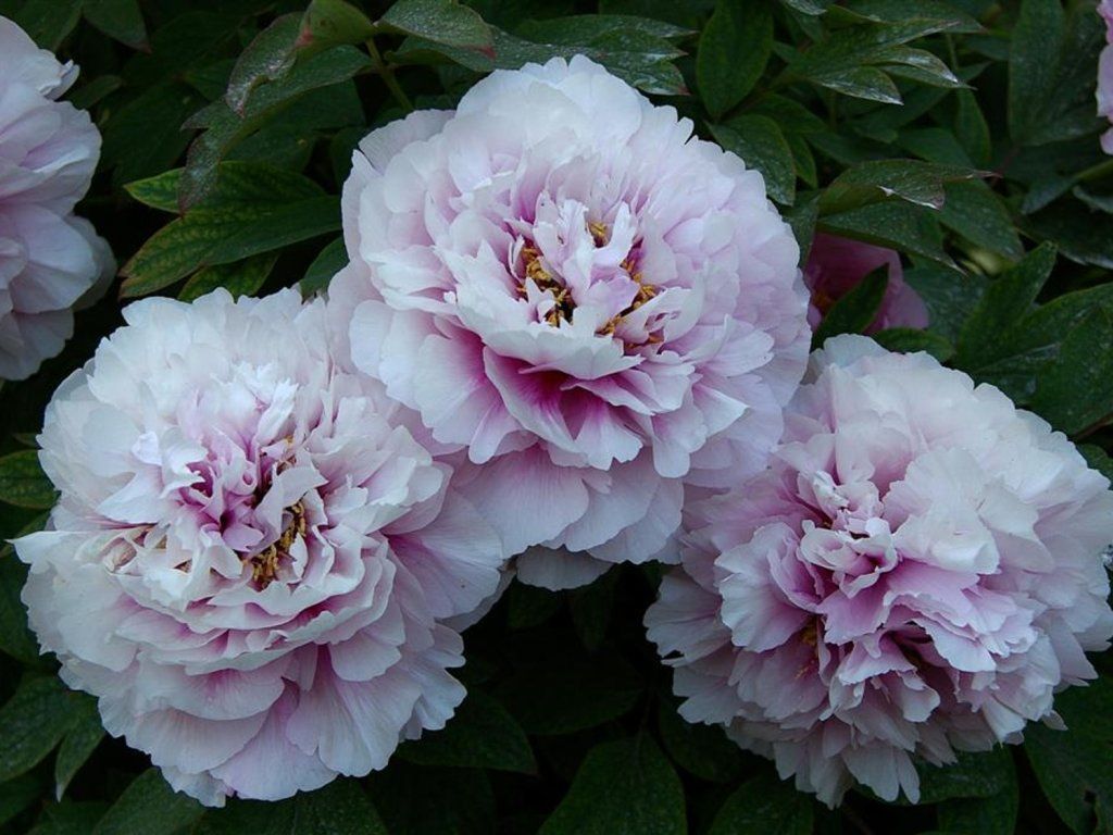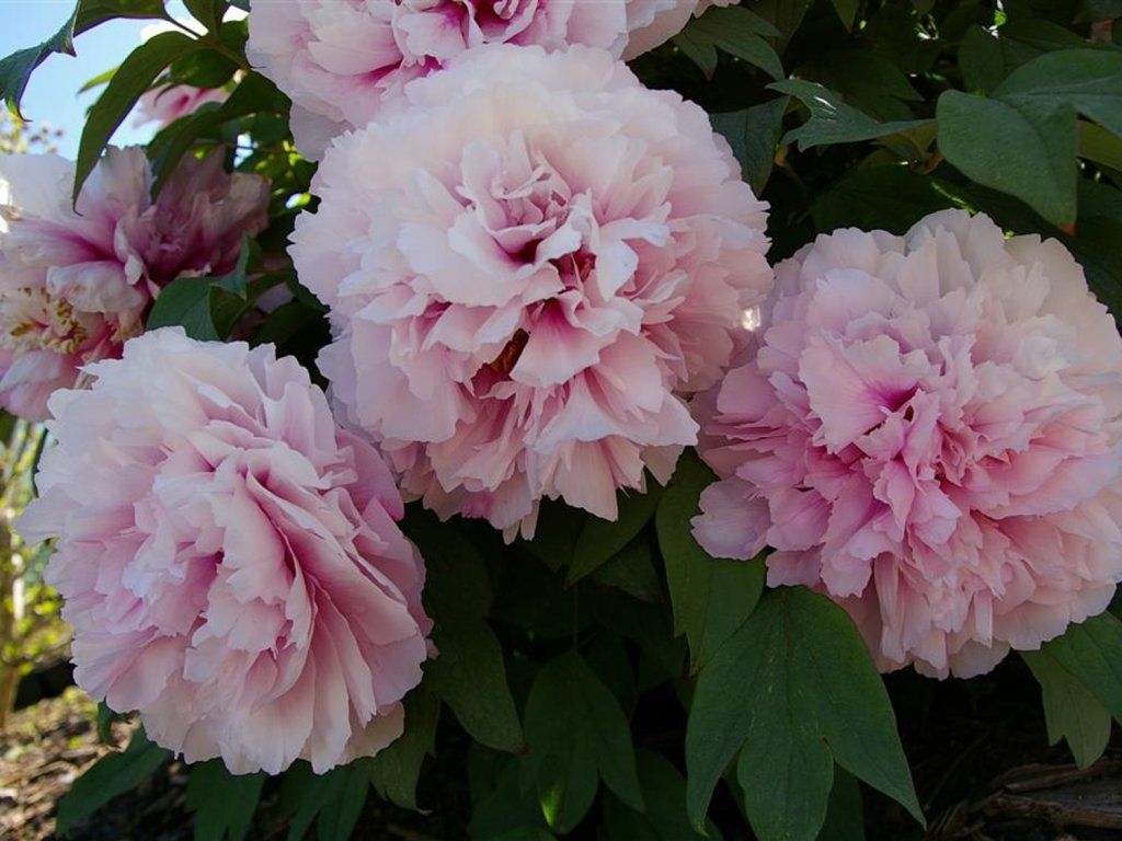 Anbau: Bevorzugt volle Sonne bis leichten Halbschatten und einen windgeschützten Standort, da große Blüten im Regen schwer werden können. Wächst am besten in tiefer, humoser und gut durchlässiger Erde mit einem pH-Wert von etwa 6,5–7,5. In Tonböden ist eine Drainageschicht und eine Beimischung von Kies sinnvoll, in leichten Böden ist hingegen ein höherer Anteil an Kompost ratsam. Die Bewässerung ist vor allem in den ersten beiden Jahren nach der Pflanzung wichtig, nach dem Einwurzeln verträgt sie kurzzeitige Trockenheit, aber lange Trockenperioden verkleinern die Blüten. Die Pflanzung erfolgt im Frühjahr oder Herbst, bei veredelten Pflanzen wird empfohlen, die Veredelungsstelle etwa 10–15 cm unter die Oberfläche zu setzen, damit der Strauch mit der Zeit eigene Wurzeln bildet. Gedüngt wird sparsam, im Frühjahr bewährt sich ein langsam lösliches Düngemittel mit einem höheren Anteil an Kalium und Phosphor, eine Überdüngung mit Stickstoff fördert weiches Wachstum. Der Schnitt beschränkt sich auf das Entfernen trockener oder gefrorener Äste nach der Blüte, eine Formgebung ist meist nicht erforderlich. Die Frosthärte ausgereifter Pflanzen liegt in der Praxis etwa bei -25 °C, Knospen können durch späte Fröste im Frühjahr geschädigt werden, daher helfen Windschatten und eine leichte Wintermulchdecke. In regnerischen Frühjahren können Grauschimmel oder Blattflecken auftreten, wertvoll sind ein luftiger Standort und eine nicht übermäßig feuchte Mulchschicht ohne direkten Kontakt mit der Stammbasis. Empfohlene Abstände betragen etwa 1,2–1,5 m je nach gewählter Komposition. In einem Kübel kommt sie nur bei ausreichender Tiefe, regelmäßiger Bewässerung und winterlichem Schutz des Wurzelballens vor dem Durchfrieren zur Geltung.