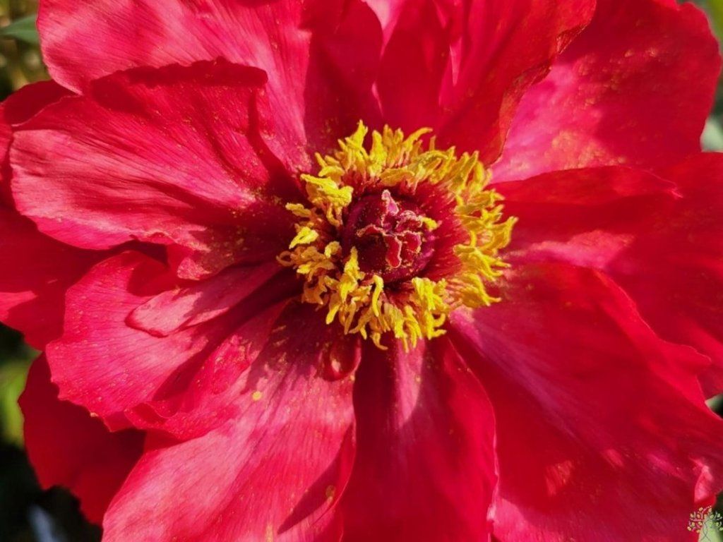 Strauchpfingstrose 'Rot halbgefüllt' - ein laubabwerfender Strauch, der eine Höhe von etwa 100 - 120 cm erreicht. Die Blätter sind wechselständig, dunkelgrün und eiförmig. Die Blüten sind größer, halbgefüllt. Sie haben eine ausgeprägt rote Färbung mit leuchtend gelben Staubgefäßen in der Mitte. Die Blüten erscheinen von Mai bis Juni. Der Wuchs ist aufrecht.