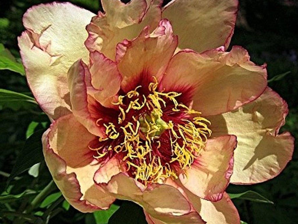 Pfingstrose 'Spring Carnival' - die verholzte Pfingstrose bildet Sträucher von 80 - 150 cm Höhe (je nach Alter), blüht im Mai bis Juni mit gelb-orange-roten, einfachen Blüten, deren Durchmesser 15 - 20 cm beträgt. Ein interessanter Kontrast. Die Baumpfingstrose ist laubabwerfend.