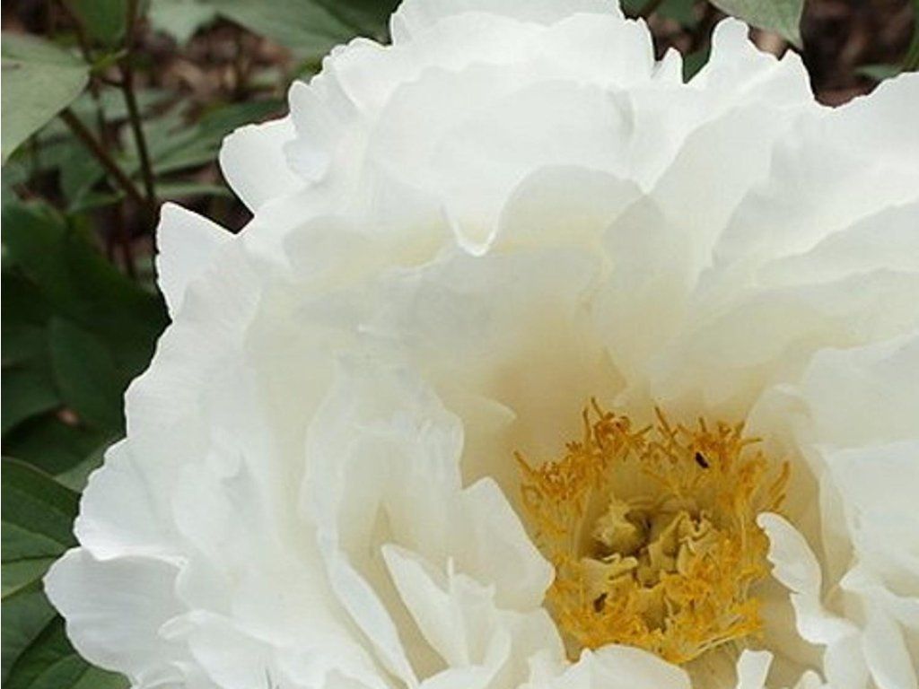 Pfingstrose 'Weiße Halbgefüllte' - laubabwerchender Strauch mit dunkelgrünen Blättern. Wächst bis zu einer Höhe von etwa 1m. Die Blüten sind größer, halbgefüllt. Sie haben eine reine weiße Farbe mit leuchtend gelben Staubgefäßen in der Mitte. Die Blüten erscheinen von Mai bis Juni.