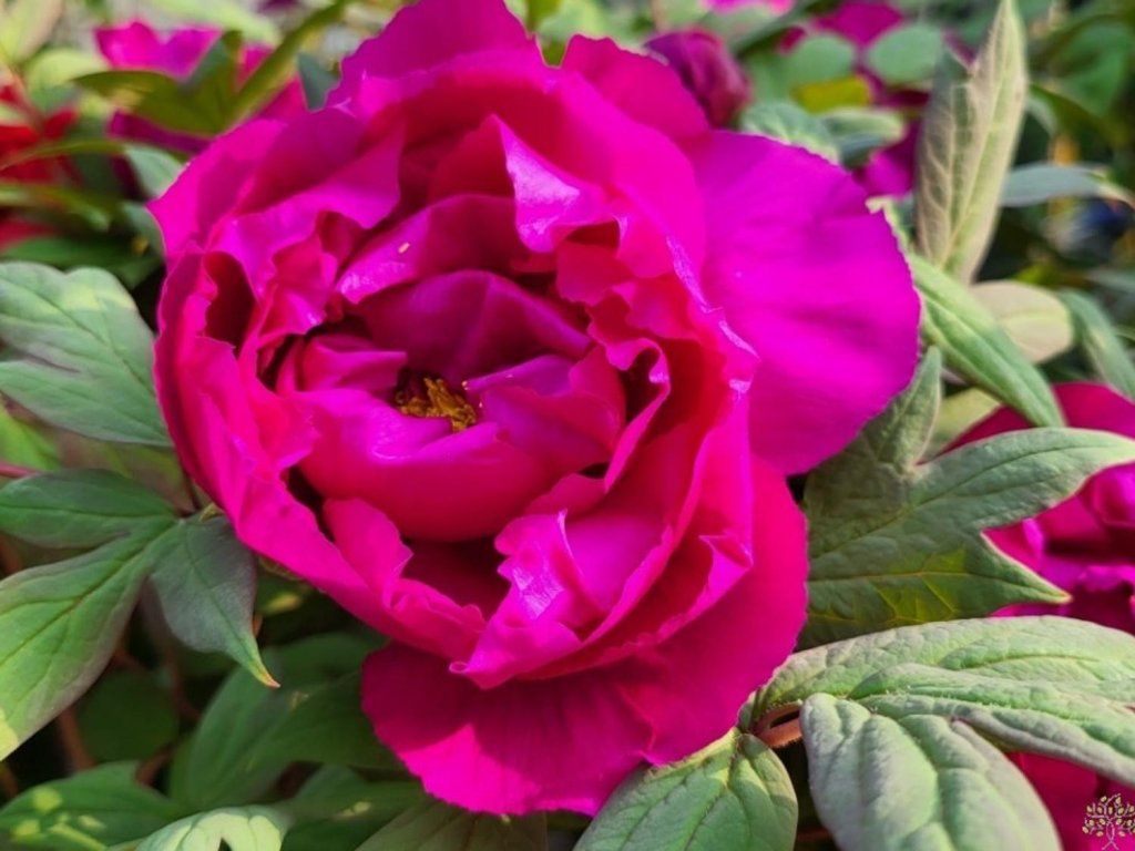 Baum-Pfingstrose 'Weinrot halbgefüllt' – eine weitere schöne und auffällige Pfingstrose mit großen und halbgefüllten Blüten. Im Sortiment unter der beschreibenden Bezeichnung für dunkelrote bis weinrote, halbgefüllte Blüten geführt. Strauchpäonien entstanden in China durch lange Auswahl und Kreuzung, und ihre verholzenden Triebe überwintern, sodass sie im Frühjahr aus dem Holz des Vorjahres austreiben. Die Pflanze bildet einen laubabwerfenden Strauch mit tief geteilten, mittel- bis dunkelgrünen Blättern, die sich im Herbst gelb verfärben können. Im Mai bis Juni öffnen sich an den Enden ausgereifter Zweige halbgefüllte Blüten, oft um die 10 cm, bei älteren Sträuchern noch ausgeprägter. Die halbgefüllte Form bietet in der Mitte einen Kranz gelber Staubgefäße mit Pollen für Bestäuber. Die Sträucher wachsen eher langsam und erreichen ihre volle Größe erst nach mehreren Jahren. In der Gartengestaltung glänzt sie als Solitärpflanze am Wegesrand, vor einem dunkleren Nadelgehölz oder in einem gemischten Strauchbeet mit Schwertlilien, Christrosen und Zierlauch. Schnittblumen werden im Stadium der angeschwollenen Knospe verwendet. Pflanzensäfte können bei empfindlichen Personen Hautreizungen verursachen.