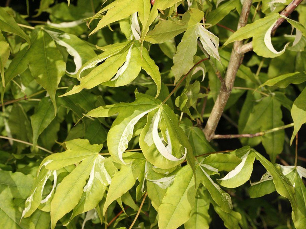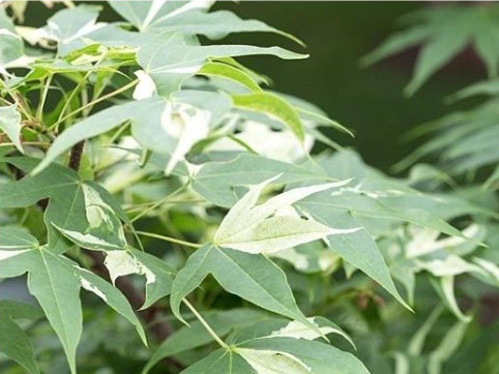 Japanischer Ahorn 'Akikaze-nishiki' - ein relativ seltener Kultivar, der langsam auf eine Höhe von 6 m und eine Breite von 4,5 m heranwächst. Sehr oft bildet er einen mehrstämmigen Baum mit einer runderen Krone. Er hat unglaublich satte, gelappte Blätter in Grün mit cremefarbener, unregelmäßiger Panaschierung. Beim Austreiben haben sie einen rosafarbenen Schimmer. Im Herbst färbt sie sich schön in leuchtenden Orange- und Scharlachtönen. Dank seiner Höhe und Anspruchslosigkeit kann er praktisch in jedem Garten verwendet werden.