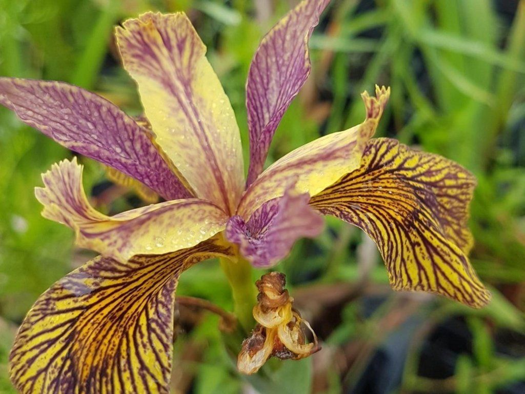 Gelbe Schwertlilie 'Holden Clough' - eine breite interspezifische Hybride aus der Gruppe der Sumpf-Schwertlilien, registriert von Donald Patton im Jahr 1971 und benannt nach der Gärtnerei Holden Clough Nursery in Großbritannien. Die Horste sind kompakter als bei der Gelben Schwertlilie und die Blätter erreichen etwa 60 cm, mit einer ausgeprägten Mittelrippe. An gut verzweigten Stielen erscheinen die Blüten im späten Frühling, normalerweise im Mai bis Juni. Die Blüten sind gelb, dicht mit Purpuradern durchzogen, der Gesamteindruck ist olivfarben bis bräunlich. Diese Sorte eignet sich als fein „bemalter“ Akzent in Feuchtpflanzungen, wo sie gut zu dunkelblättrigen Seggen, Wasserfeder und Sibirischen Schwertlilien passt. Sie erreicht eine Höhe von etwa 60–70 cm. Der Pollen wird als steril beschrieben und die Samenkapseln bilden sich nur selten, was die natürliche Ausbreitung begrenzt. In wärmeren Regionen kann ein Teil des Laubes auch über den Winter grün bleiben, in unserem Klima ziehen sich die Blätter wie bei den meisten Rhizom-Schwertlilien normalerweise zurück. Sie ist auch wegen ihrer Anziehungskraft für Bestäuber wie Bienen und Schmetterlinge beliebt. LDie Blätter sind schwertförmig, hellgrün mit einem blau-grauen Schimmer. Ideal für den Rand von Teichen und Bächen.
