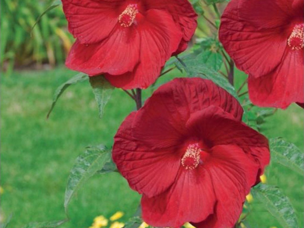 Sumpf-Eibisch SUMERIFIC® 'My Valentine' - ein wunderschöner, romantischer Hibiskus, der sich durch große, auffällige Blüten und dichtes Laub auszeichnet und somit zu einem Blickfang in jedem Beet wird. Die Pflanze erreicht eine Höhe von 90–120 cm und eine Breite von etwa 90 cm, und bildet einen kompakten Strauch mit regelmäßigem Wuchs. Die Blüten sind groß, haben einen Durchmesser von bis zu 20 cm und zeichnen sich durch eine tiefe, satte rote Farbe aus, die dem Garten ein luxuriöses Aussehen verleiht. Sie erscheinen reichlich von Juli bis Oktober und sorgen so für eine lange Blütezeit. Diese dramatischen Blüten bilden einen wunderschönen Kontrast zu den frischgrünen, herzförmigen Blättern. Wie andere Sumpf-Hibiskusarten treibt er im Frühjahr später aus, daher besteht kein Grund zur Sorge, wenn er nach dem Winter längere Zeit inaktiv bleibt.