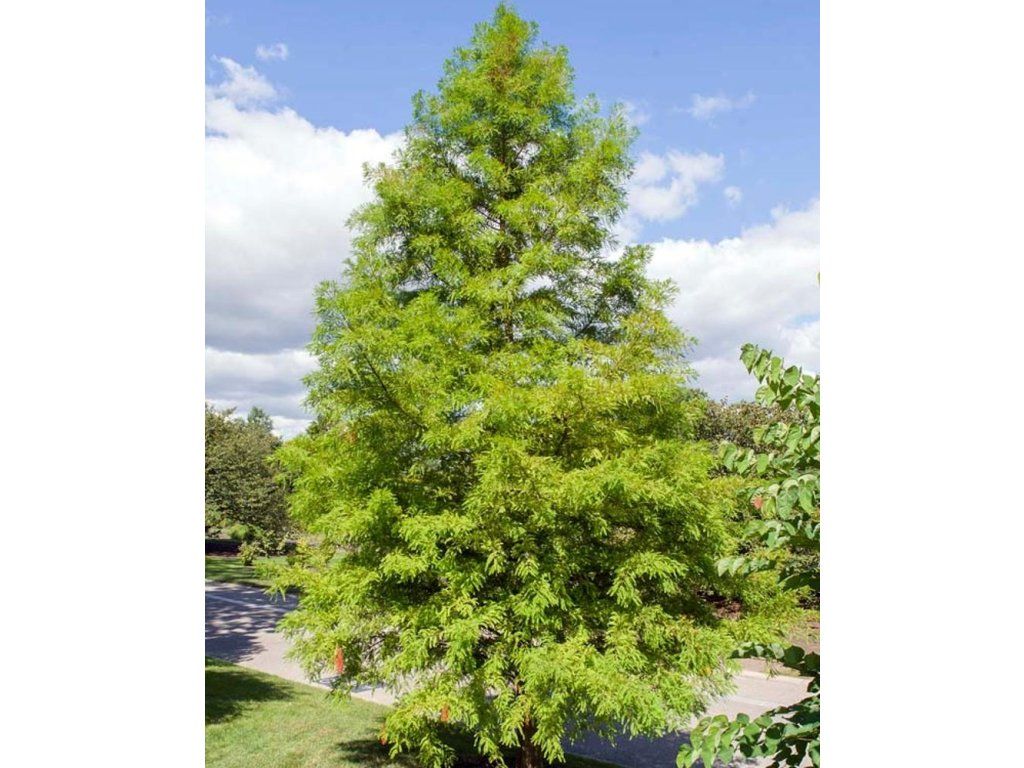 Sumpfzypresse - ein laubabwerfender Nadelbaum aus der Familie der Zypressengewächse, der aus dem Südosten Nordamerikas stammt, wo er natürlich in Auenwäldern, Sümpfen und entlang von Flüssen wächst. Im Erwachsenenalter erreicht er normalerweise eine Höhe von 20–30 m und eine Breite von 8–12 m, mit einer regelmäßigen kegelförmigen bis breit kegelförmigen Krone. Das Wachstum dieses Baumes ist mittelschnell, kann aber innerhalb weniger Jahrzehnte beträchtliche Ausmaße erreichen. Die Nadeln sind weich, flach, zweireihig angeordnet, 1–2 cm lang, im Frühjahr hellgrün, im Sommer tiefgrün und im Herbst färben sie sich orange bis braun und fallen dann ab. Diese Farbtransformation schafft einen erstaunlichen Kontrast in der Landschaft, wenn die Baumkrone warme und leuchtende Farbtöne annimmt, was ein bekanntes und sehr ästhetisches Merkmal dieses Baumes darstellt. Die Rinde ist rotbraun, faserig und schält sich allmählich ab. Unter natürlichen Bedingungen bildet er Atemwurzeln, sogenannte Pneumatophoren, die auch in Gartenpflanzungen an sehr feuchten Standorten auftreten können. Die Blüten sind unauffällig, die Zapfen kugelförmig, 2–3 cm groß. Der Baum ist weder giftig noch dornig und wird als Solitär, an Gewässern, in Parkkompositionen und Landschaftsgestaltungen eingesetzt, wo seine Textur und saisonale Veränderung zur Geltung kommt. Sie wird hauptsächlich als Zierpflanze verwendet und zeichnet sich besonders durch ihre Frische und Leichtigkeit in der Gartengestaltung aus. Sie kann auch dunklere Umgebungen angenehm und unaufdringlich beleben, besonders im Herbst, wenn sie beeindruckende Kontraste zu anderen Nadelbäumen vor dunklem Hintergrund bildet. Sie passt hervorragend zu Uferbepflanzungen, anderen Nadel- und Laubgehölzen, die schlanke Formen haben.