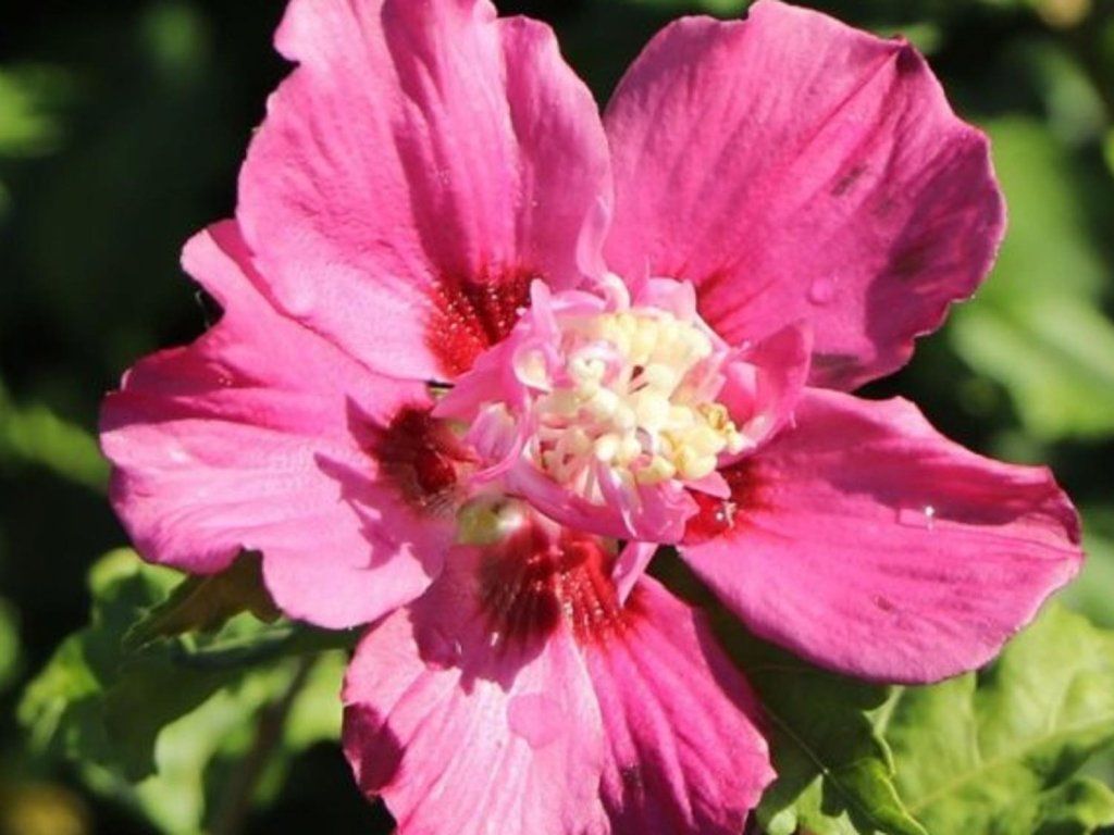 Hibiskus syriacus 'Duc de Brabant' (buntblättrig) - dieser Kultivar erreicht eine Höhe von 1,5 - 2,5 m bei gleicher Breite. Es handelt sich um einen laubabwerfenden Strauch, der aufrecht wächst. Er zeichnet sich durch eine attraktive Panaschierung aus. Die Blätter sind dreilappig, weiß-grün und verfärben sich im Herbst gelblich. Von Juli bis September ist er mit vollen, großen und leuchtend rosa Blüten übersät. Ideal als Solitärstrauch oder schön in Kombination mit Stauden, die die Sonne genauso lieben wie Hibiskus.