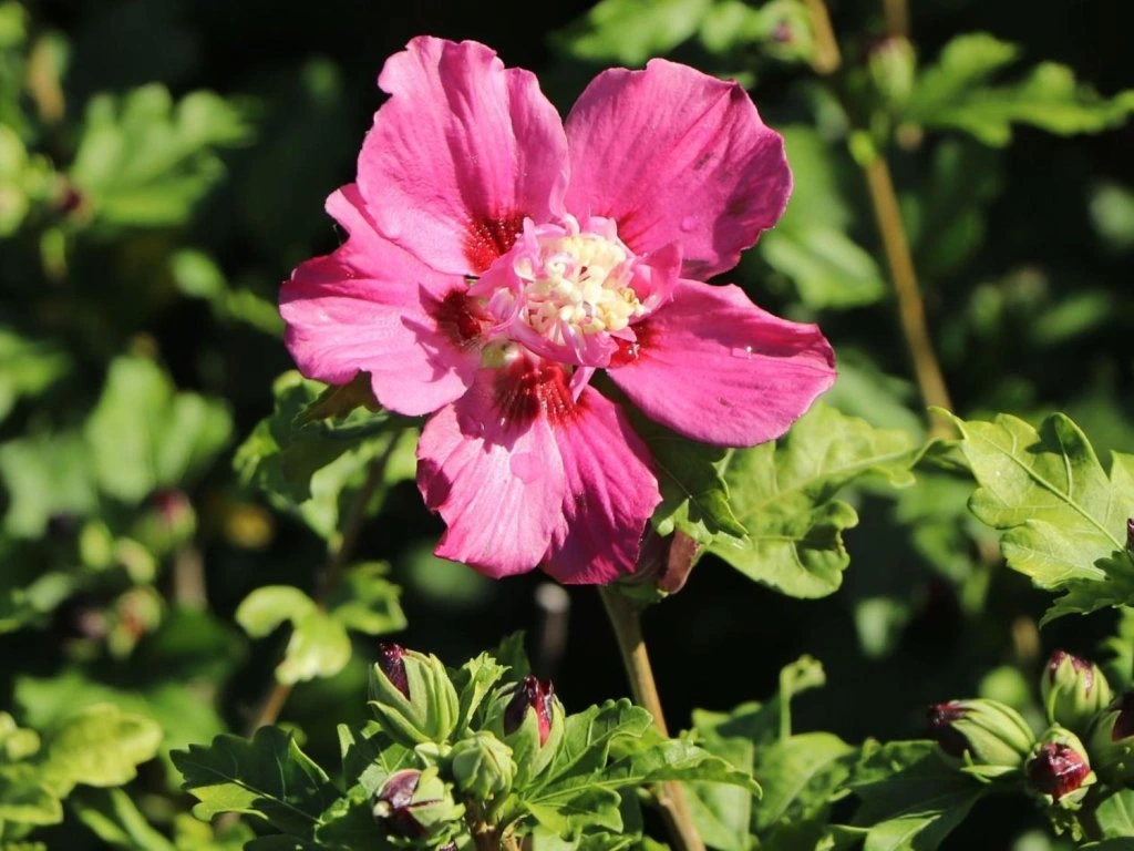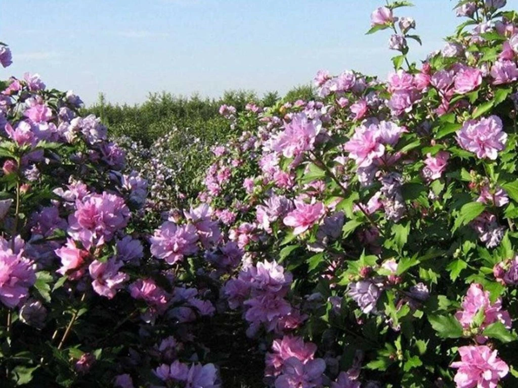 Pflege: Es wird ein sonniger, warmer und windgeschützter Standort empfohlen, z. B. die Süd- oder Südwestseite des Hauses oder geschützte Höfe. Der Boden sollte lehmig bis lehmig-sandig, mäßig feucht, gut durchlässig und humusreich sein. Hibiskus verträgt einen pH-Wert von leicht sauer bis leicht alkalisch, einschließlich Böden mit höherem Kalziumgehalt. Beim Pflanzen werden oft Kompost oder gut verrotteter Mist hinzugefügt, bei schweren Böden hilft das Einmischen von Kies oder grobem Sand zur Verbesserung des Wasserabflusses. Containerpflanzen werden von März bis Oktober gepflanzt, in kälteren Regionen wird der Frühjahrstermin bevorzugt, damit der Strauch vor dem Winter Wurzeln schlagen kann. Für Hecken werden in der Regel Abstände von 0,8-1,2 m gewählt, als Solitär benötigt er etwa 2-3 m Platz. Die Bewässerung ist im ersten Jahr nach der Pflanzung und während längerer Trockenperioden am wichtigsten, zwischen den einzelnen Bewässerungen sollte der Boden leicht abtrocknen. Die jährliche Frühlingsdüngung mit Kompost oder Dünger für blühende Sträucher fördert die Bildung von Blütenknospen. Der Rückschnitt erfolgt im Spätwinter oder frühen Frühjahr, wobei schwache, gefrorene oder sich kreuzende Äste entfernt werden und die Vorjahrestriebe um ein Drittel bis zur Hälfte gekürzt werden können. Junge Pflanzen profitieren von einer Wintermulchschicht am Fuß des Strauchs. Der Hibiskus ist in der Regel widerstandsfähig; bei langer Trockenheit können Blattläuse oder Spinnmilben auftreten, die die jüngsten Triebe schwächen. An einem gut gewählten Standort handelt es sich um ein langlebiges, pflegeleichtes Gehölz mit garantiertem Sommerflor.