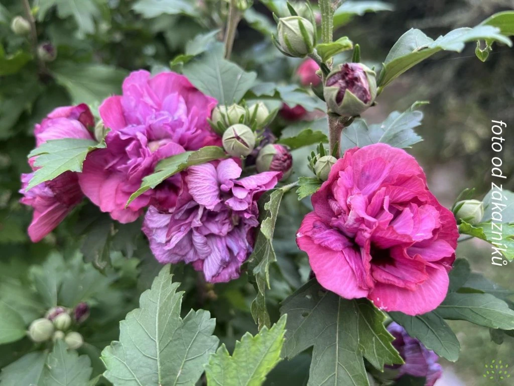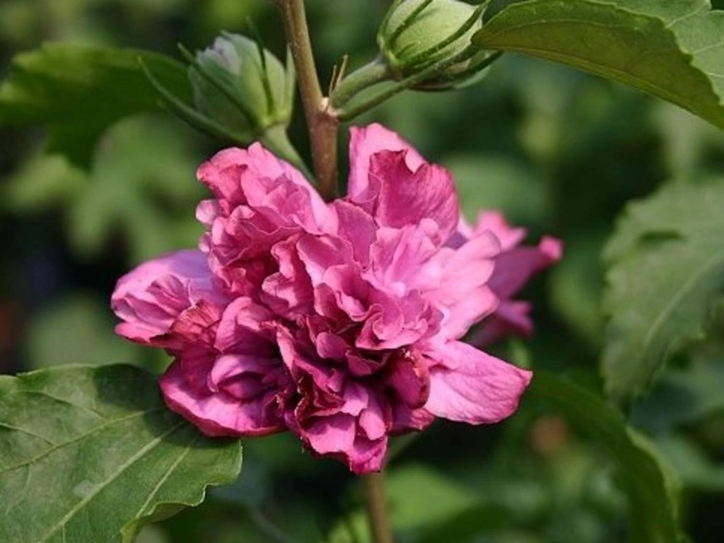 Hibiskus syriacus 'Duc de Brabant' - ein laubabwerfender Strauch aus der Familie der Malvengewächse, der aus Züchtungen stammt, die auf eine Art aus Ostasien zurückgehen. In den Gärten Mitteleuropas entwickelt er sich zu einer markanten spätsommerlichen Dominante. Unter unseren Bedingungen erreicht er eine Höhe von 200-300 cm und eine Breite von 150-200 cm, mit steifen, aufrechten Ästen, die mit zunehmendem Alter eine breit vasenförmige Wuchsform bilden. Die Blätter sind dreilappig, 4-8 cm lang, mittel- bis dunkelgrün und verfärben sich im Herbst gelb. Er treibt relativ spät aus, was für Hibiskus typisch ist und hilft, junge Blätter vor Frühlingsfrösten zu schützen. Von Juli bis September öffnen sich in den Achseln der diesjährigen Triebe gefüllte Blüten in rosa-roten bis rot-violetten Farben mit dunklerem Zentrum, mit einem Durchmesser von 6-8 cm. Die Blüten erinnern an kleinere Malvenblüten, jede hält etwa einen Tag, aber zahlreiche Knospen sorgen für eine kontinuierliche Blüte bis in den Herbst hinein. Die Pflanze zieht bestäubende Insekten an und wirkt in ihrer Blütenpracht lebendig und warm. Sie findet Verwendung als Solitärgehölz an Terrassen und Eingängen, in Reihen freiwachsender Hecken sowie in gemischten Strauchgruppen. Sie lässt sich gut mit Stauden des Spätsommers und Ziergräsern kombinieren, wo die rosa-roten Blüten mit den goldenen und silbrigen Tönen von Rispen und Ähren kontrastieren.