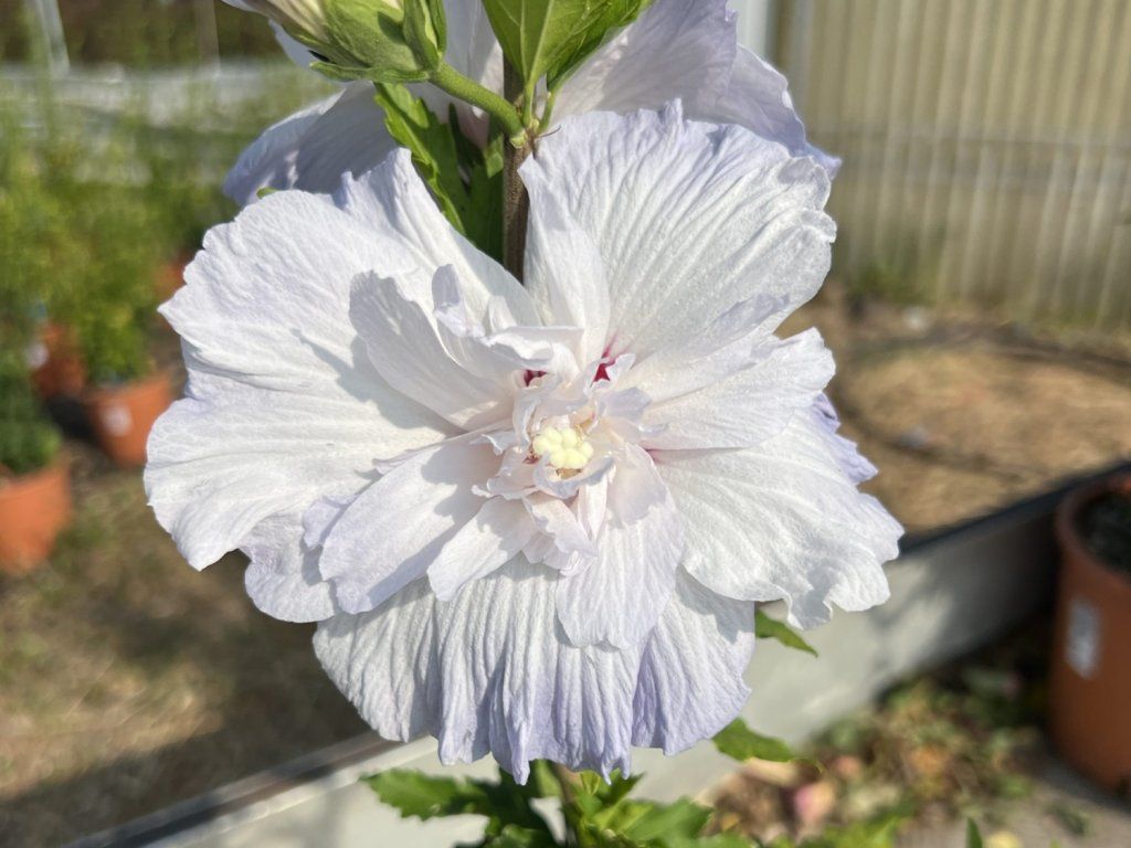 Syrischer Eibisch 'Igloo' - ein laubabwerfender Strauch aus der Familie der Malvengewächse, gezüchtet in europäischen Baumschulen mit Schwerpunkt auf rein hellen Blüten. Der Habitus ist aufrecht, dicht verzweigt und erreicht in der Gartenpraxis eine Höhe von ca. 1,5–2 m und eine Breite von 1–1,5 m. Die Blätter sind dreilappig, mittel- bis dunkelgrün, treiben relativ spät im Frühjahr aus und vergilben im Herbst. Von Juli bis September öffnen sich Blüten von meist 8–10 cm, weiß, mit einem kühlen blau-violetten Schimmer an den Rändern, der an einen zarten Tintensaum erinnert. Bei einigen Blüten erscheint ein kleines rotes Auge, das Zentrum ziert eine cremefarbene Staubgefäßsäule. Die Blüten sind kurzlebig, aber die Knospen wechseln sich schnell ab, sodass der Strauch den späten Sommerrhythmus hält. Der helle Farbton kommt vor einem dunklen Zaun gut zur Geltung, in Kombination mit Lavendel, Katzenminze und Gräsern oder als beruhigendes Element zwischen tiefrosafarbenen Hibiskus-Kultivaren. Bienen und Schmetterlinge suchen die Blüten auf, vollere Formen können für Bestäuber etwas weniger zugänglich sein als einfache. Nach der Blüte können sich grüne Samenkapseln bilden, die im Winter allmählich vertrocknen, bei modernen Kultivaren ist die Samenbildung jedoch oft eingeschränkt. Der hellblühende Strauch kommt auch in einem weißen Garten mit Hortensien, Schneeball und weißen Sonnenhüten gut zur Geltung, wo gerade der kühle Blütenrand hervorsticht. In Stadtgärten bewährt er sich, wenn die Wurzeln nicht austrocknen.