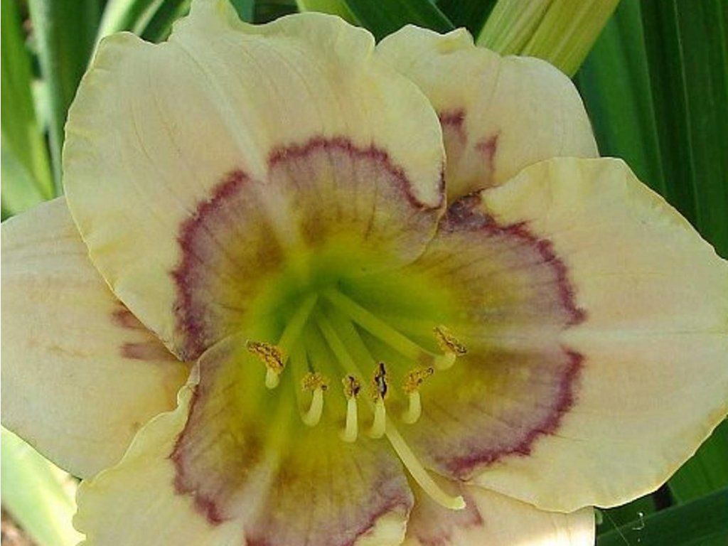 Taglilie 'All American Baby' - eine wunderschöne Staude, die bis zu 40 cm hoch wird. Die Blüten sind fast weiß mit einer purpurnen Zone um die grün-gelbe Kehle. Schön gewellte Blütenblattkanten. Sie blüht ab Mai. Sie hat grüne, schmal geformte, lange Blätter, die in Büscheln wachsen und in wärmeren Regionen immergrün sind. In unseren Breiten stirbt im Winter der oberirdische Teil ab.