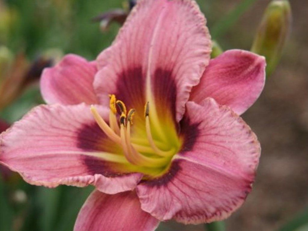 Taglilie 'Always Afternoon' - eine wunderschöne Staude, die bis zu 60 cm hoch wird. Die Blüten sind rosa mit einer purpurnen Zone um ein grün-gelbes Herz. Ihre bunten Blüten ähneln Lilien. Schön gewellte Blütenblattkanten. Sie blüht von Juni bis August. Sie hat grüne, schmal geformte, lange Blätter, die in Büscheln wachsen und in wärmeren Regionen immergrün sind. In unseren Breiten stirbt im Winter der oberirdische Teil ab.